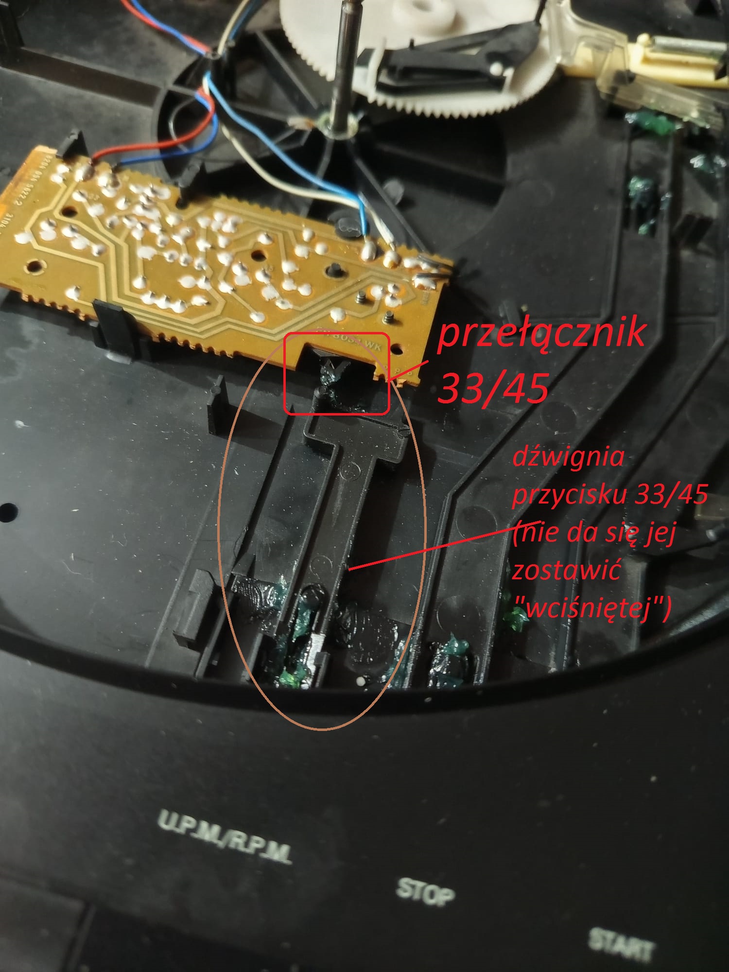 Posiadam gramofon Grundig PS4200, który przywracam do życia. Został mi ostatni problem. Selektor prędkości w pozycji "wyciśniętej" jest na 33 RPM a "wciśnięty" zwiera stycznik (foto) i przełącza napięcie na silniku i obroty są na 45. Niestety przycisk nie pozostaje w pozycji "wciśniętej" - podejrzewam brak sprężynki/blaszki (jak w izostatach). Przestudiowałem service manual i nie widzę tam żadnego takiego elementu. Może ktoś posiada taki gramofon o mógłby poratować zdjęciem elementów tego przycisku (pod talerzem) ?