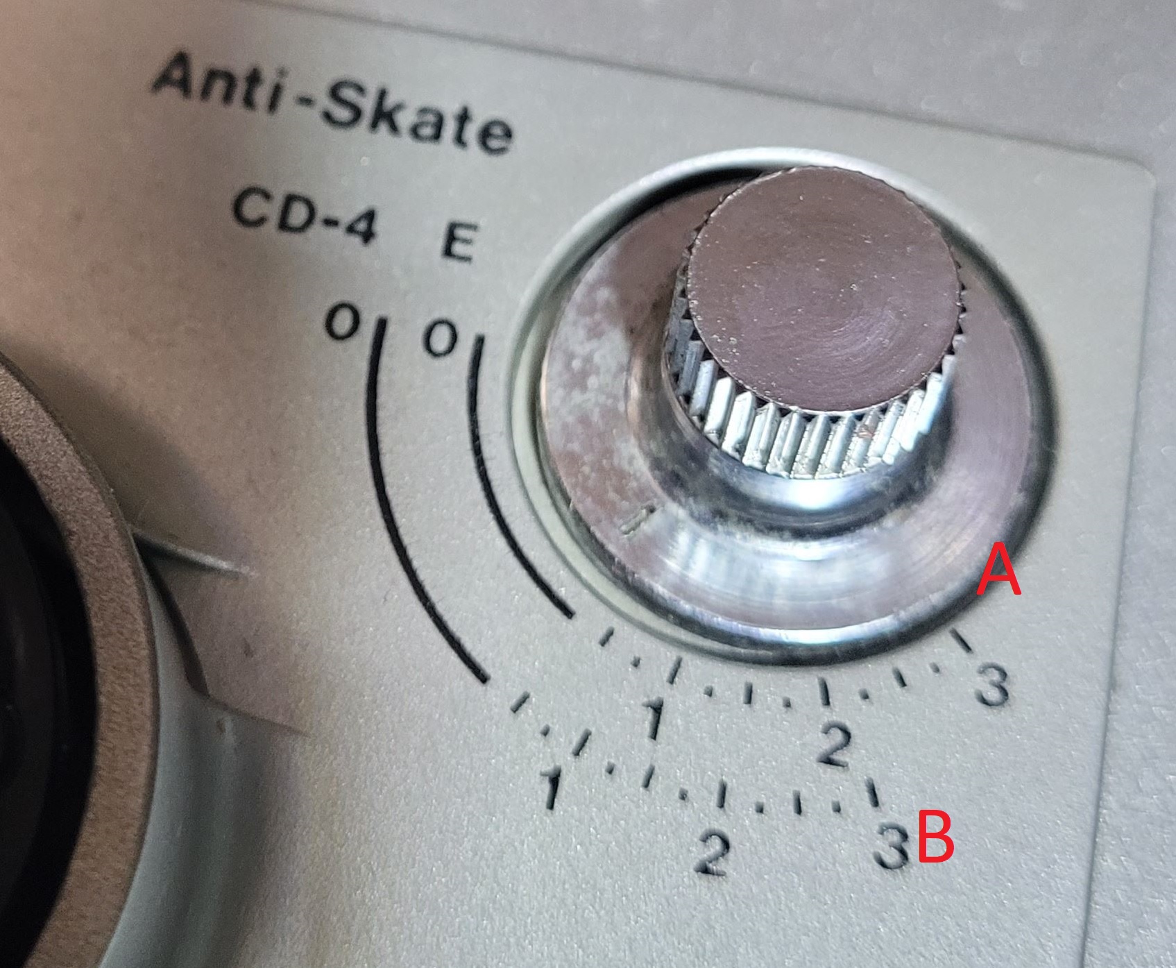 Teraz antiscating. W instrukcji na rysunku technicznym pokrętła od antiscatingu jest tylko jedna skala. Tymczasem pod pokrętłem w moim gramofonie są dwie skale (zaznaczyłem je na zdjęciu jako A - górna i B - dolna). Która z nich odpowiada za antiscating?