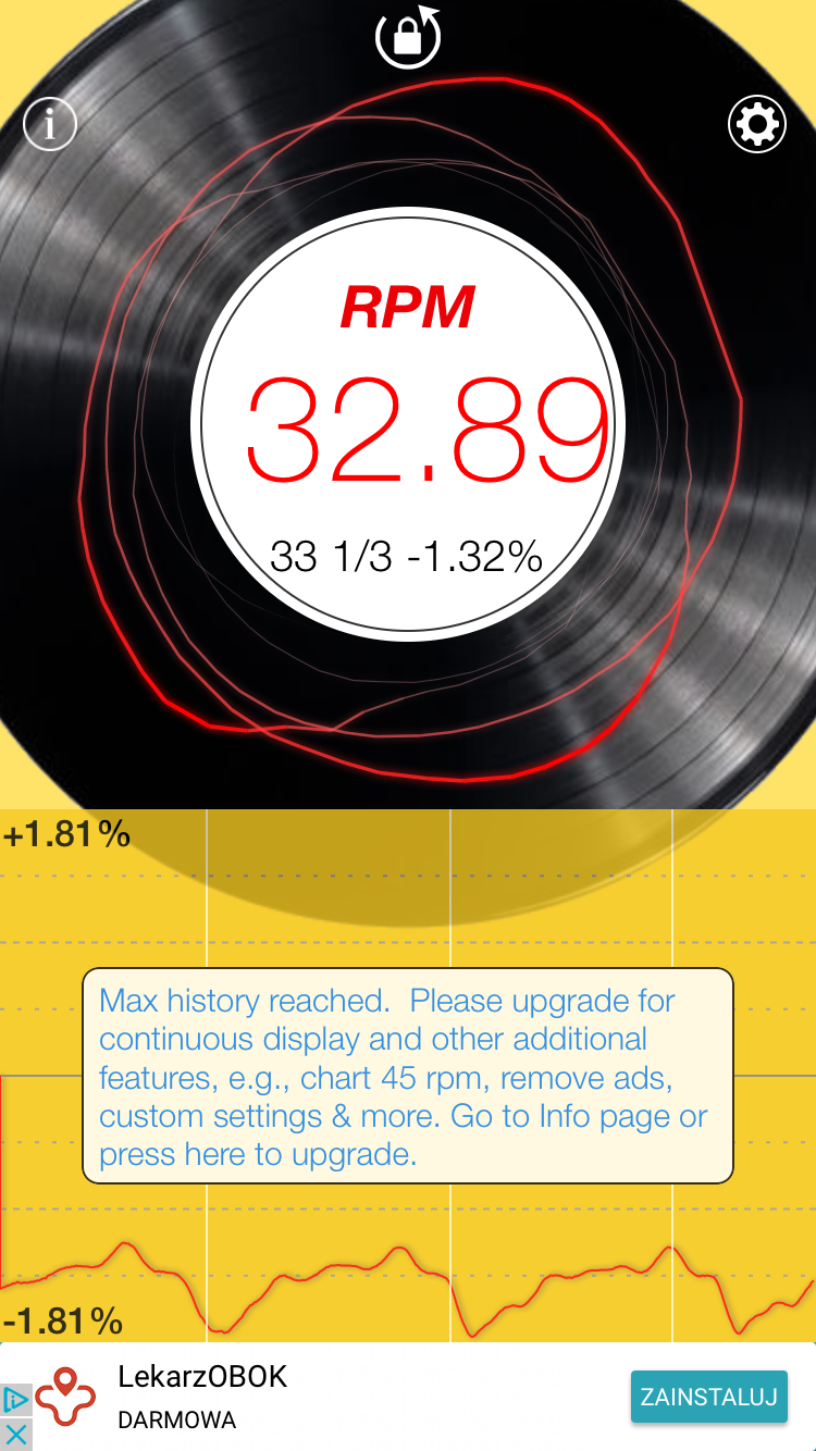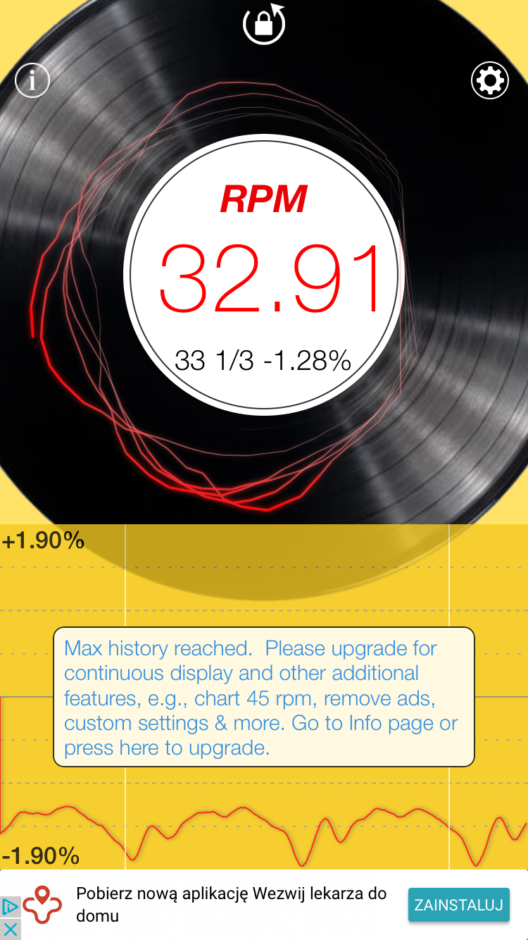 Nic takiego nie widzę. Rozkręciłam co się dało, podokręcałam co się dało. Prędkość nadal poniżej 33 1/3. Sprawdziłam prędkość obrotową dodatkowo apliakcją na telefonie i pokazuje ok 32,85 (nie wiem czy to daje odczyt prawidłowy).