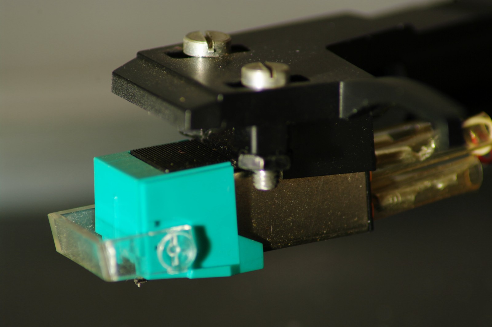Wkładka, hmm... to chyba jakiś "no name", bo żadnej informacji na niej nie widzę. Ostrość ustawiona na igłę - może za dużo nie widać, ale wydaje mi się, że trzeba będzie niedługo ją wymienić, a co na pewno - wyczyścić. Obawiam się, że żeby wymienić igłę, trzeba będzie wymienić wkładkę.