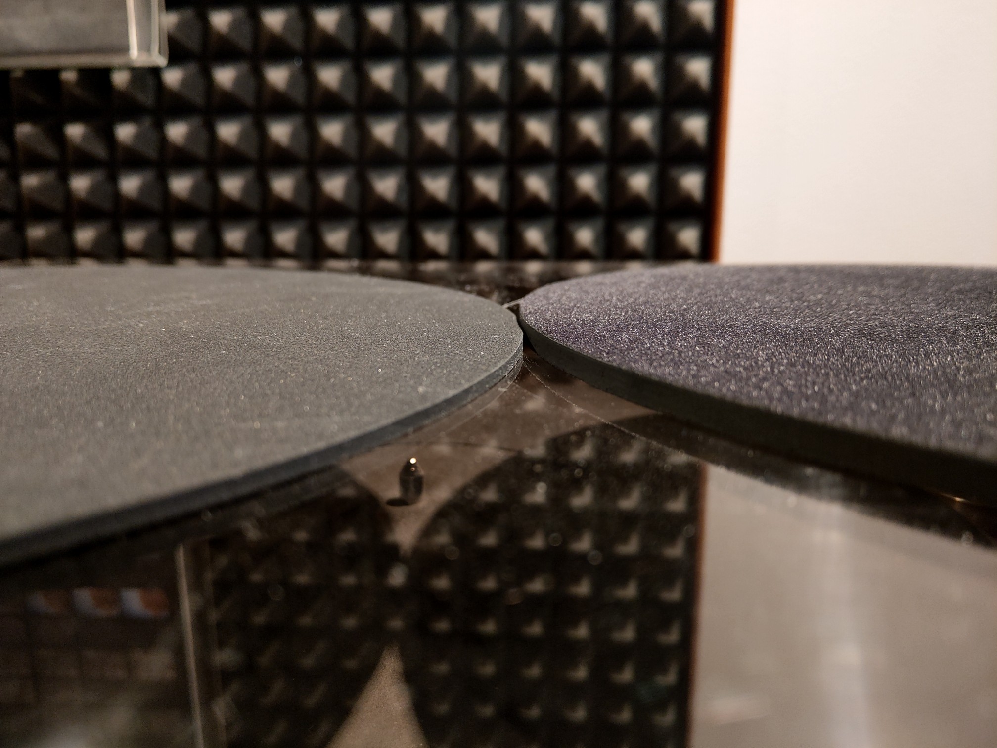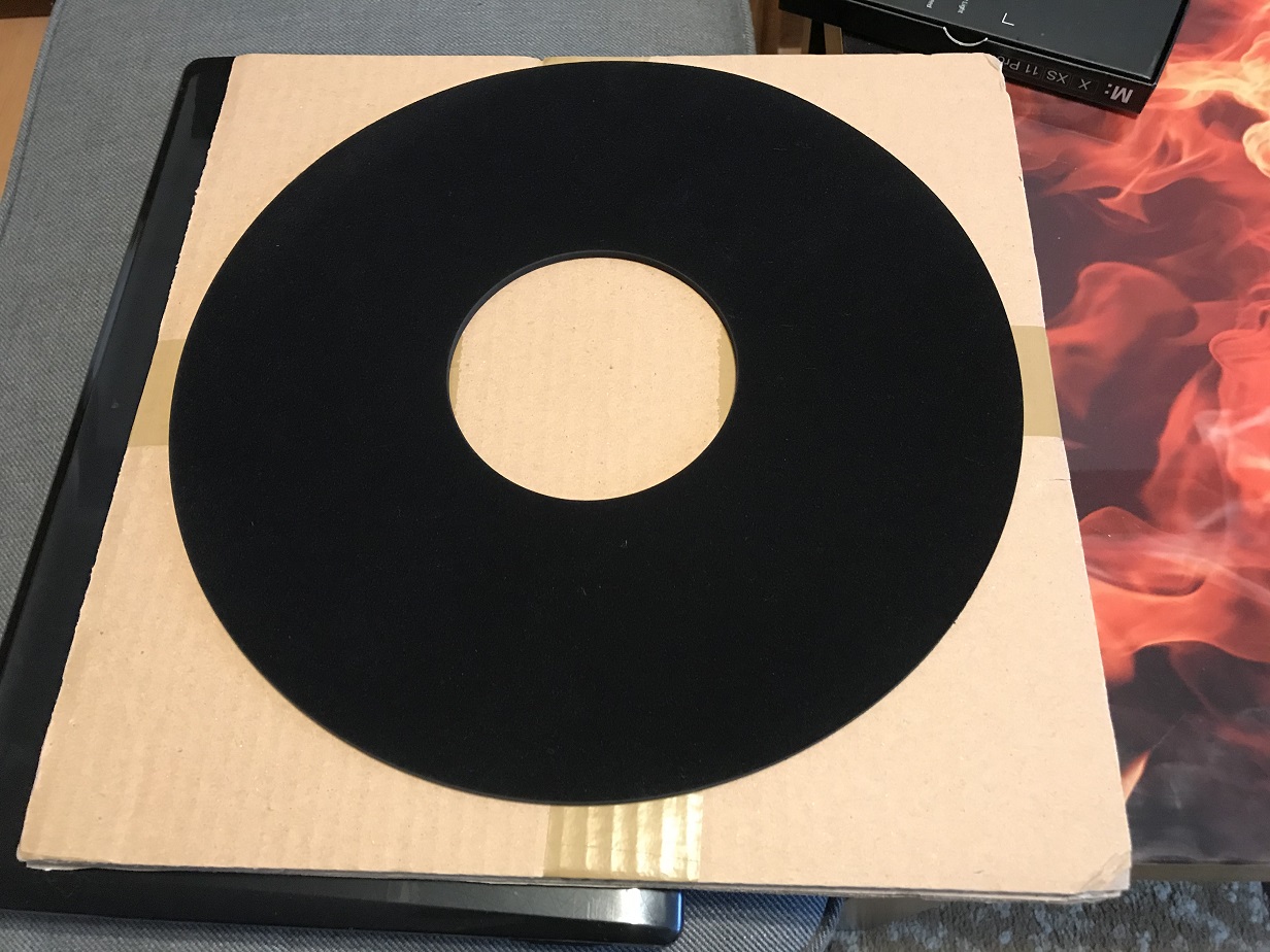 Szukałem ostatnio maty gramofonowej o średnicy 292 mm. Zamówiłem na allegro. Wykonana z mikrogumy o grubości 3 mm. Mata bardzo ładnie wykonana w kolorze grafitowym. Wygląda super. Szukałem jednak maty troszkę grubszej i sporo cięższej. Sprzedający zaproponował rozwiązanie na bazie pełnej gumy o dużej gęstości z naklejoną cienką warstwą weluru. Wyszło to super. Mata waży ok 500g a ma grubość 4,8 mm a czarny welur przypomina szczoteczkę do czyszczenia płyt. Wykonanie bardzo estetyczne. Do pełni szczęścia brakuje zagłębienia na label ale przy miękkim welurze uważam, że nie jest konieczny.