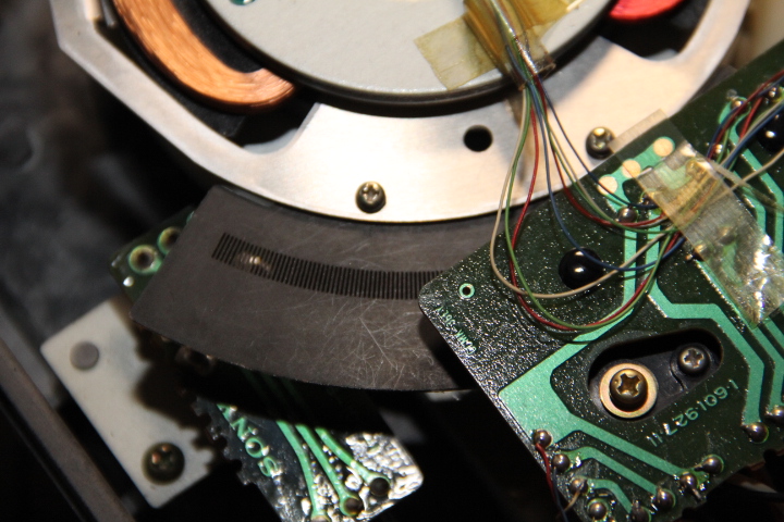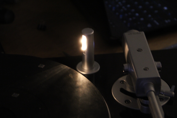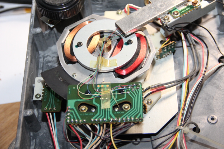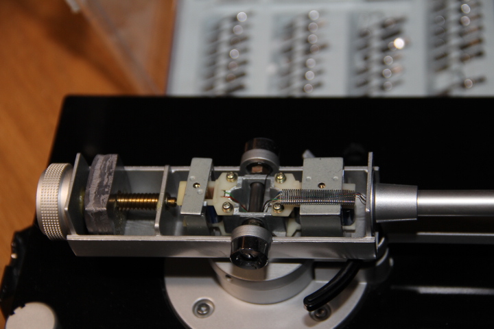 Fragment umieszczony "na zewnątrz" w dużej tajemniczej puszce, to zespół odpowiedzialny za nacisk igły. Reszta siedzi "pod pokładem", ale o tym kiedyś indziej. Składa się z dwóch cewek mechanicznie połączonych z podstawą ramienia. Wewnątrz tych cewek poruszają się metalowe rdzenie połączone z ramieniem. Nacisk realizowany jest przez przepuszczanie odpowiedniego prądu przez cewki. Prąd regulowany jest pokrętłem na panelu. Widoczna na zdjęciach przeciwwaga służy tylko do zbalansowania ramienia (0g). Nacisk można zmieniać nawet w trakcie odtwarzania płyty. Skala na pokrętle niestety nie odpowiada wskazaniom wagi, ale możliwe że to wina wagi za 30PLN.