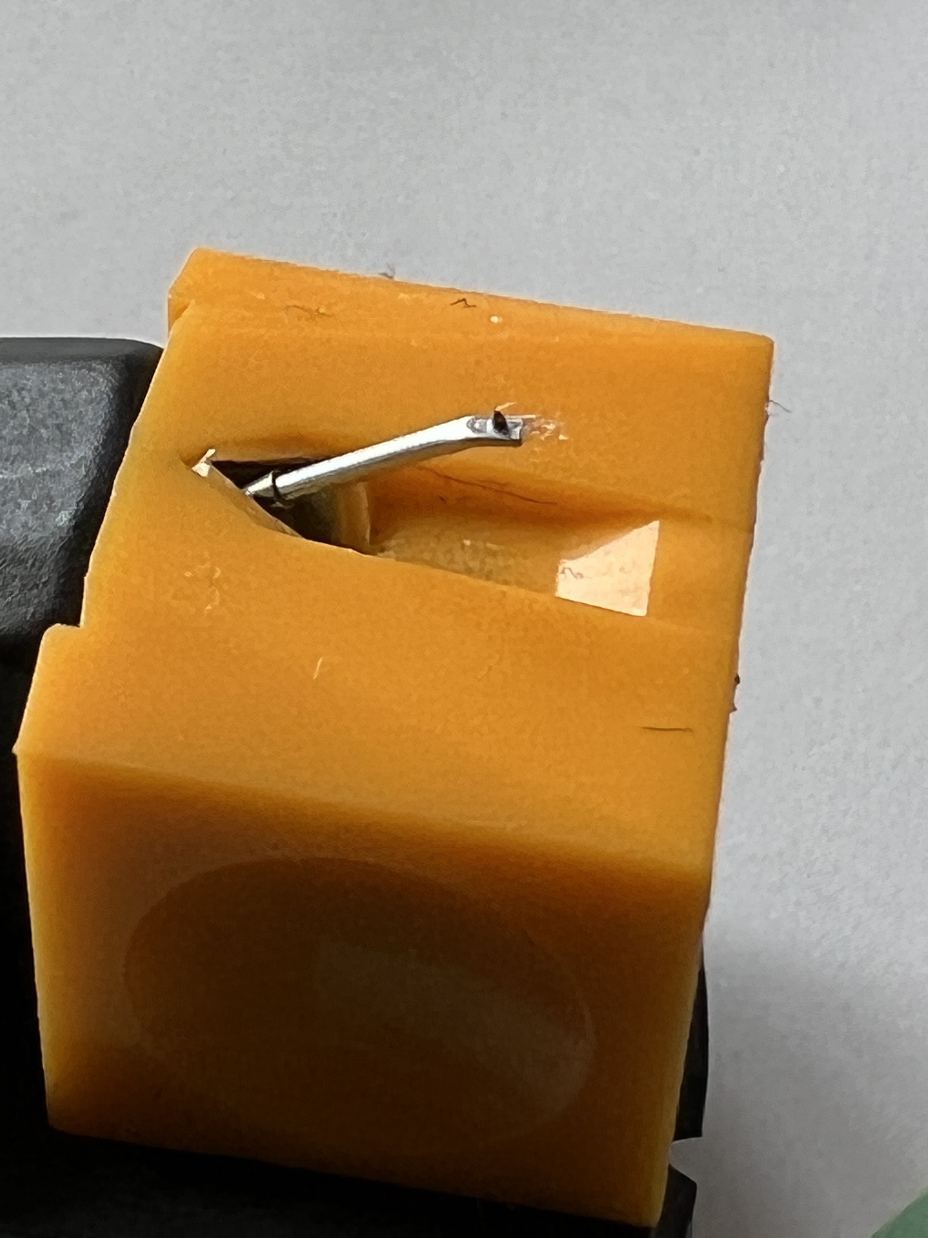 3. W szczelinę gdzie igła się chowała pod naciskiem, wstawiłem milimetrowy (albo i pół) kawałek gumy, który blokuje igłę.