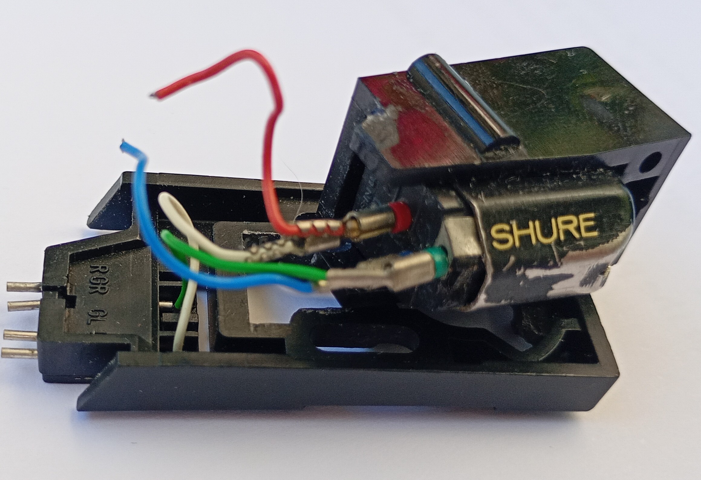 Kupiłem właśnie nowa igłę i zauważyłem, że moja jedyna wkładka Shure zaczęła się rozpadać. Zakładam, że ma swoje lata. Wypiely się dwa z czterech kolorowych kabli. Nie jestem w stanie tego sam naprawić. Ułamała się niewielka plastikowa część. To akurat dałbym radę przykleić. Dwie śrubki mocujące po bokach zniknęły i nie ma po nich śladu.