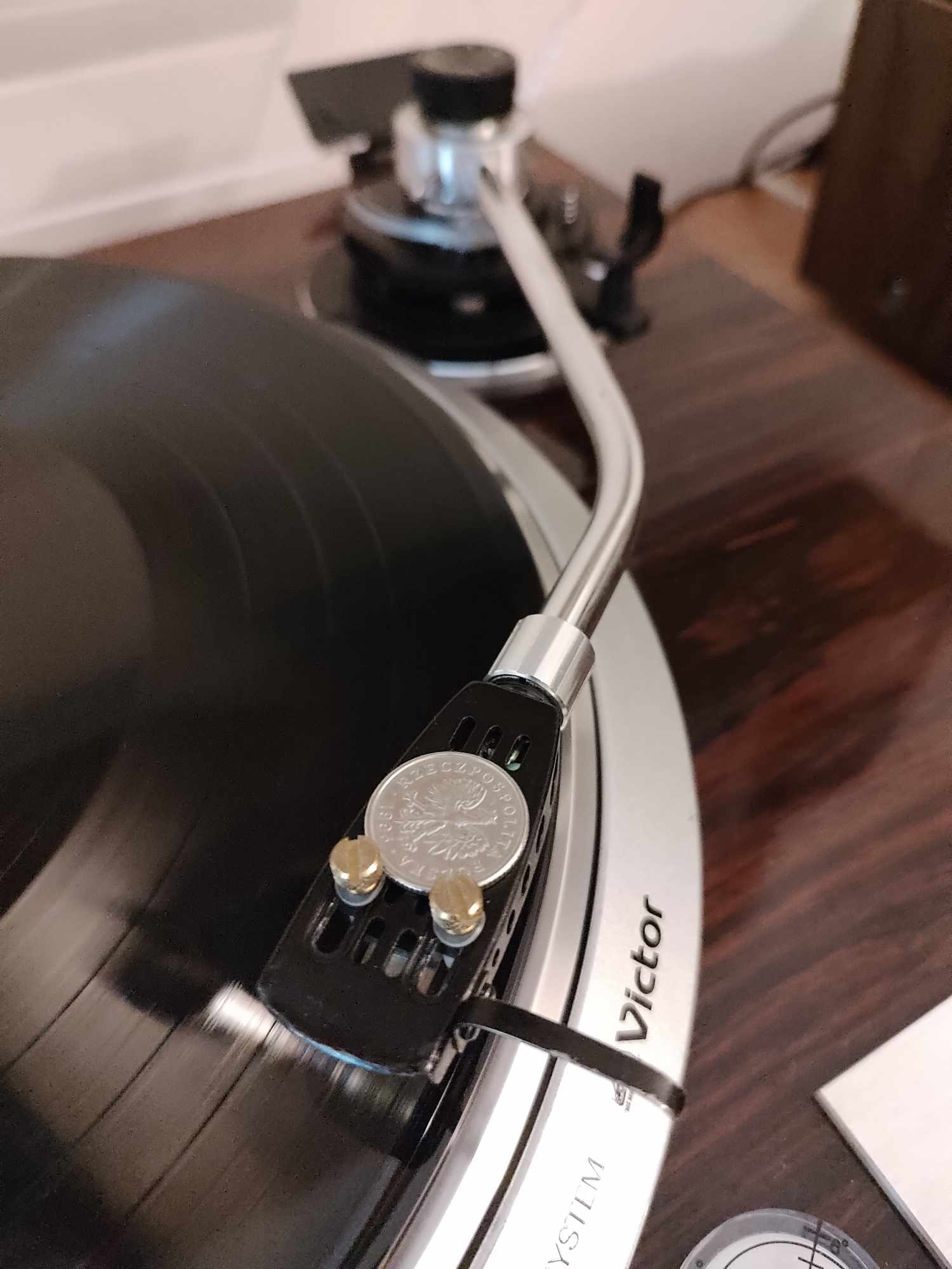 Eksperymentalna technika kreatywnego tworzenia czegoś z niczego na potrzebę chwili. W związku z brakami początkującego winylomaniaka w wyposażeniu w headshele i jednoczesną potrzebą przetestowania wkladki, z odsieczą przygalopował na bialym koniu...nie, nie D. Tusk :D. Bond. James Bond. No prawie ;) Luke. Winylowy Luke. Oto poniżej wykonany przez niego,jak to ładnie ujął: Frankenstein :lol: No i wszystko byloby fajnie gdyby nie jeden maly szkopuł: dla mojego gramiaka okazał się za lekki... :think: przy maksymalnym wkręceniu cieżarka ramie lecialo do góry...Mała burza mózgów, kilka pomysłów. No i stanęło na ...50 groszach. Prawie jak u Kazika :D Ważne ze sie udalo! No i teraz sobie gra. Jest dobrze!