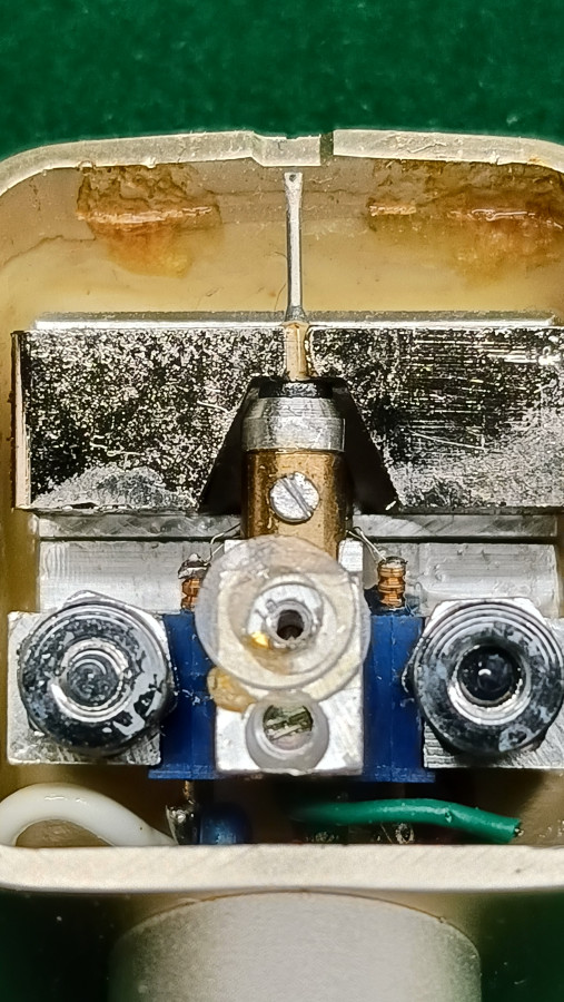 A tutaj mamy taki wynalazek. Ni to MC, ni to MM. Tak czy siak wspornik igły stabilizowany jest przez sznureczek:-). Sznureczek spadnie i jest kłopot. Dziwna konstrukcja.