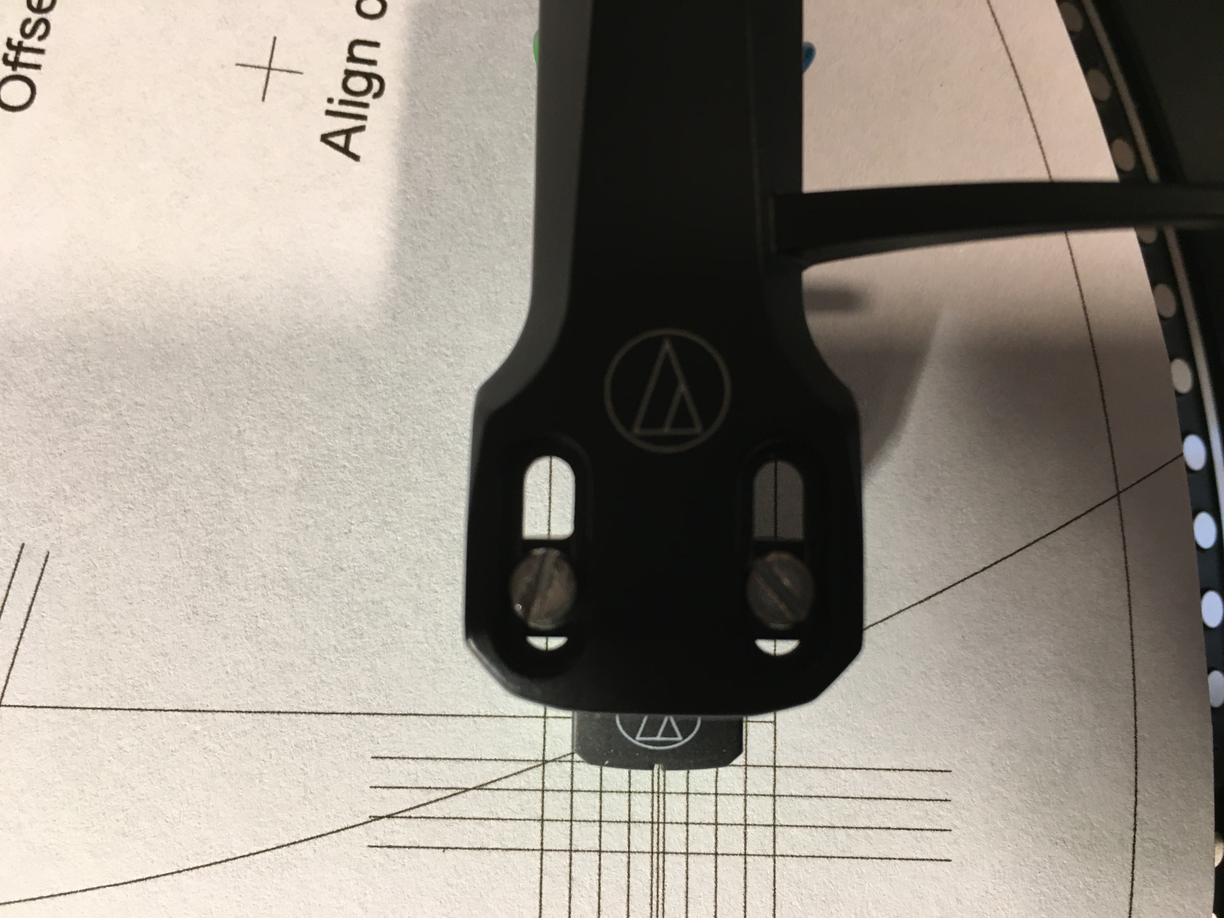 To by tłumaczyło poniekąd fabryczne ustawienie mojej wkładki. Nikt w fabryce pewnie się nie bawi w precyzyjne ustawianie wg siatki, biorą przymiar 52mm (typowy dla Technicsa) i ustawiają wkładkę wg niego równolegle do headshella - różnica w efektywnej długości ramienia, kąt, oraz overhang różnią się praktycznie tylko w setnych częściach mm, co i tak okiem jest nie do stwierdzenia.