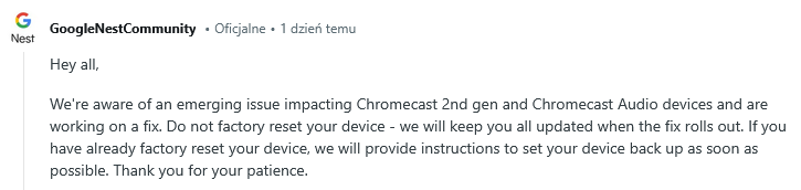 Jesteśmy świadomi pojawiającego się problemu dotyczącego urządzeń Chromecast 2. generacji oraz Chromecast Audio i pracujemy nad jego rozwiązaniem. Nie resetujcie urządzenia do ustawień fabrycznych – poinformujemy Was, gdy poprawka zostanie udostępniona.