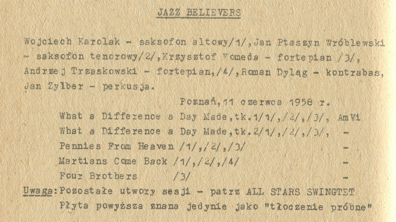 Po paru miesiącach otrzymałem pokaźną paczkę, zawierającą czternaście nieopisanych płyt, z białymi nalepkami na środku każdej z nich. Do płyt dołączono pismo, że nagrania i styl są very good, ale wytwórnia RCA nie jest nimi zainteresowana komercyjnie. Powysyłałem więc płyty muzykom, a zanim moja gdzieś się zapodziała, wiele razy słuchałem jej z satysfakcją. To naprawdę było fajne granie i uszłoby nawet pod względem technicznym, ale nie mogło wytrzymać konkurencji z nagraniami w amerykańskich studiach RCA w owym czasie. Różnice w wykonawstwie taktowanie pomijam, chociaż wstydu nie było. Kto dziś jeszcze ma tego longplaya w zbiorach, ma rzeczywiście super białego kruka – i to z Wojciechem Karolakiem na saksofonie!