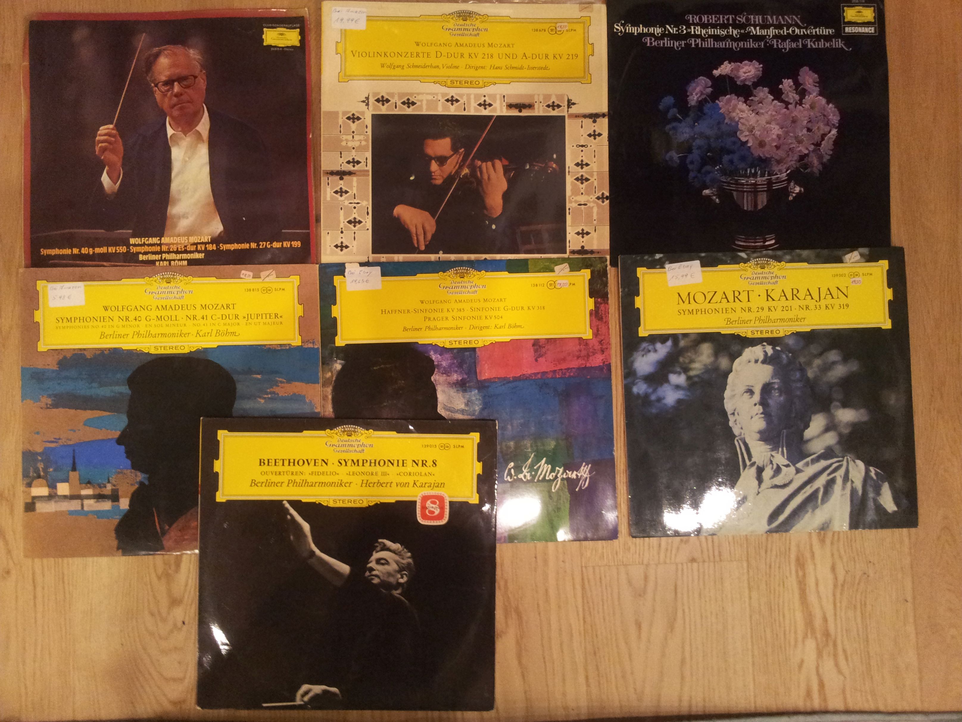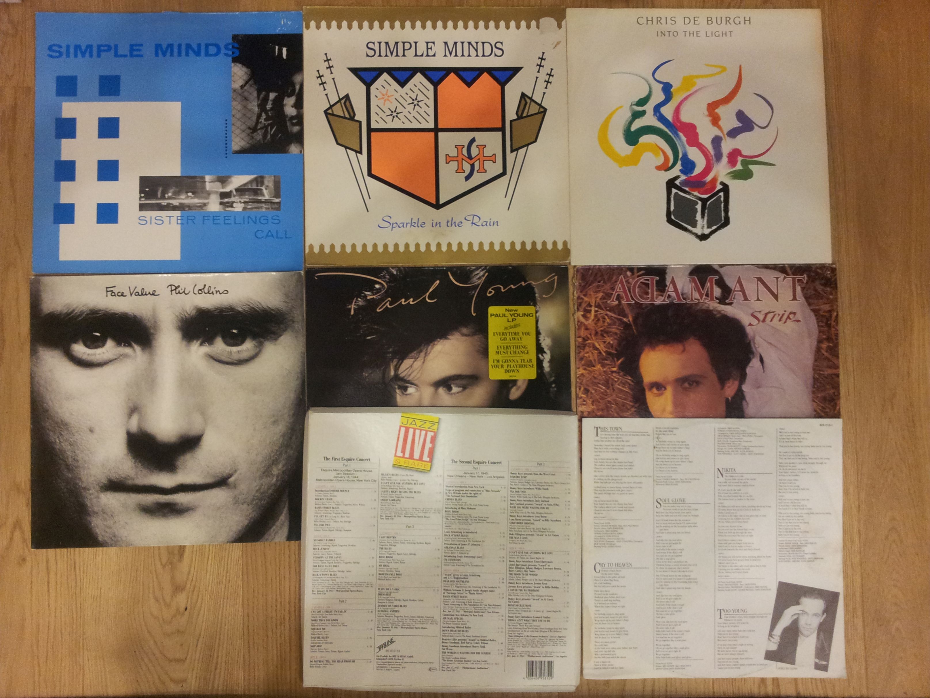 W zestawie 2x Simple Minds, Chris De Burgh, Phil Collins, Paul Young, Adam Ant, Elton John (bez okładki niestety), Box: The First i Second Esquire Concert (niestety niekompletny - tylko trzy płyty) oraz 7 płyt z Deutsche Grammophon (w tym 2x Karajan i 3x Bohm). Co ciekawe niektóre płyty mają odręczne naklejki (widoczne na zdjęciu) z ceną przeznaczoną na ebay, ale mocno zawyżoną chyba porównując z cenami na discogs.