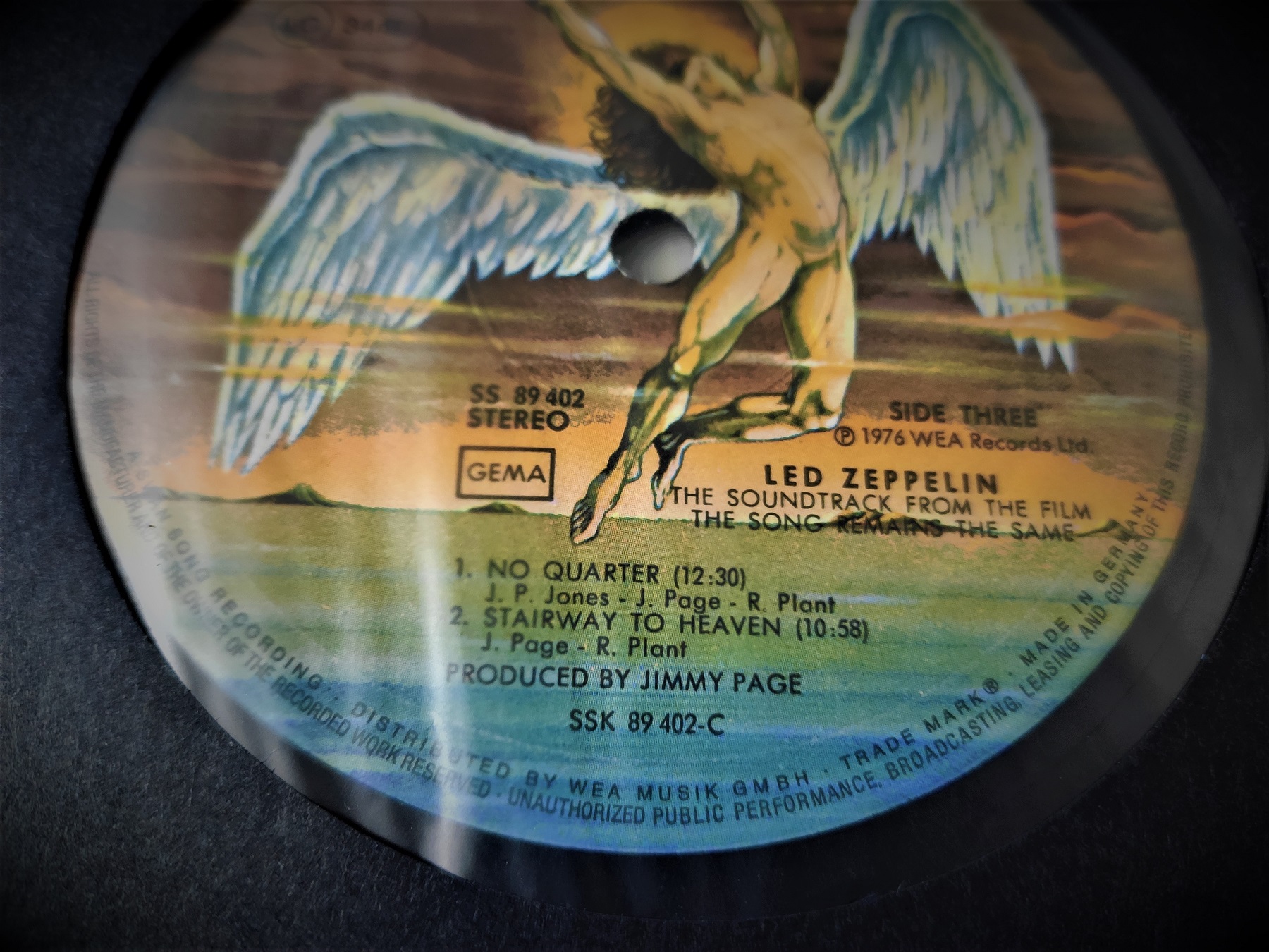 Właśnie odkryłem, że ten konkretny egzemplarz został złożony z dwóch różnych. Płyty są niemieckie (SS 89 402), okładka amerykańska (SS2-201/1198). Czy jest możliwe, że tak go wypuszczono do sprzedaży? Czy raczej ze względu na zły stan okładki niemieckiej zamieniono ją później na amerykańską, w która z resztą nieelegancko ingerowano poprzez zamalowaniem czarnym markerem wytartych miejsc? Płytę kupiłem kiedyś w antykwariacie (za niewielkie pieniądze), wiec druga wersja wydaje się być bardzo prawdopodobna.