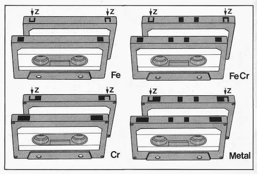 Odcinek instruktażowy dla posiadaczy magnetofonów z automatycznym wyborem rodzaju taśmy. Od góry:<br />Taśma żelazowa ( Fe) TYP I<br />Taśma chromowa ( CrO2) TYP II<br />Taśma żelazowo- chromowa (FeCr) TYP III - nie ma na zdjęciu.<br />Taśma metalowa  TYP IV