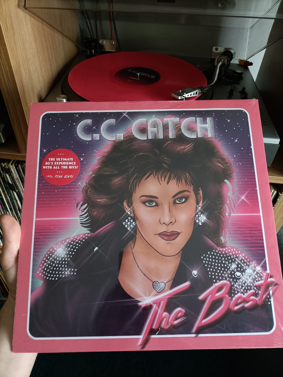 Skusiłem się w środę na taką różową kompilację C.C. Catch za niecałe 15 funtów nówka sztuka - same hiciory spod ręki Dietera Bohlena, dzisiaj właśnie przyniósł listonosz. Ogólnie jest to moja druga płyta w kolorze innym niż czarna, gdzieś się spotkałem z opinią że te kolorowe winyle niby brzmiały gorzej niż czarne, ale może to w latach wcześniejszych? Moje ucho chyba nie słyszy różnicy, a jeżeli już to na chyba na korzyść bo dwa albumy C.C. Catch miałem z bułgarskiego Balkantonu w niezbyt dobrym stanie
