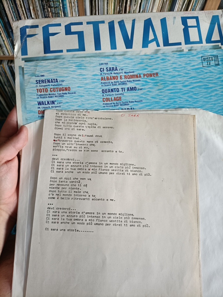Z zagranicznych też trochę mam ale najbardziej chyba rozczulił mnie ten tekst '"Ci Sara'' napisany na maszynie z ręcznie naniesionymi diakrytykami, włożony do okładki do płyty kompilacyjnej z festiwalu w San Remo z 1984 gdzie zwyciężyła ta właśnie piosenka. Ktoś musiał być równie wielkim fanem Al Bano i Rominy Power jak ja