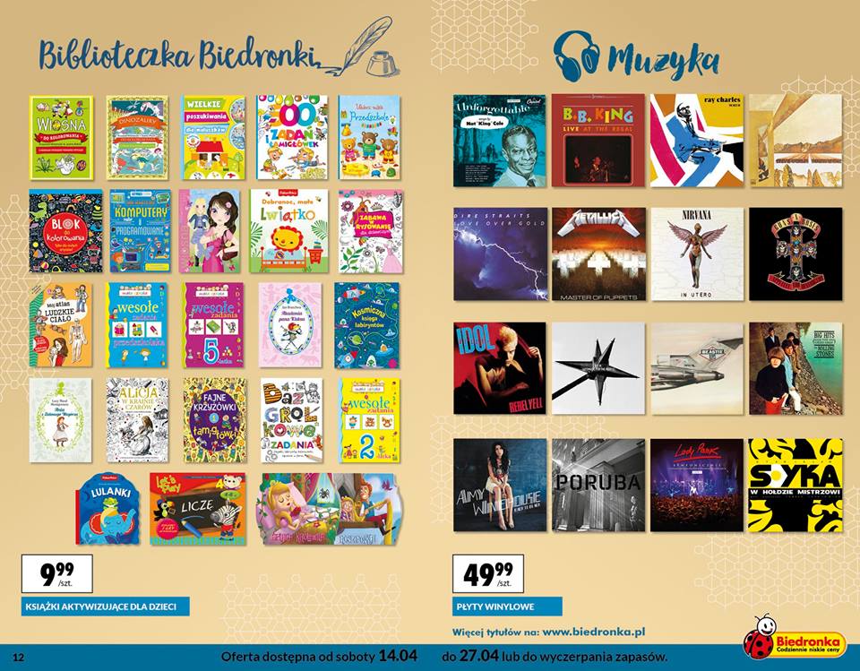 W aktualnej ofercie sieci znajdą się propozycje dla miłośników różnych gatunków muzycznych, od dźwięków soulu po brzmienie rockowe. Melomani będą mogli sięgnąć po muzykę m.in. Ray’a Charlesa, B. B. Kinga, a także nagrania Stevie Wondera czy Amy Winehouse. Fani mocniejszego brzmienia znajdą w Biedronce albumy takich zespołów jak m.in. Metallica, Nirvana czy Megadeth. Wszystkie płyty winylowe będą dostępne w cenie 49,99 zł/szt., od 14 do 27 kwietnia br. lub do wyczerpania zapasów.