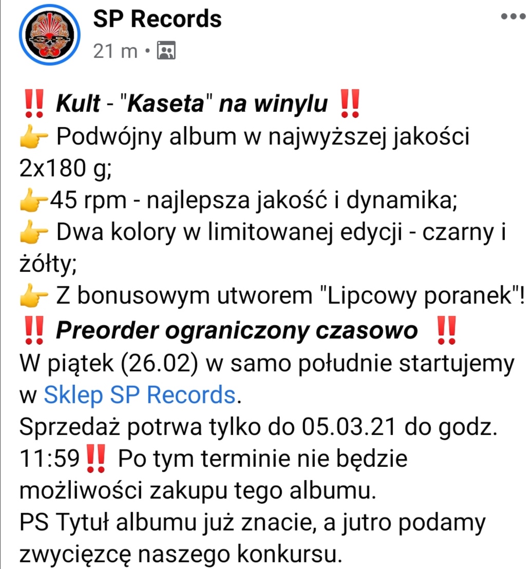 Nooo taaak sorki, coś mi się ceny pomyliły. Anyway muszę go mieć. Daj koniecznie info jak dojdzie, faktycznie znakomita cena, aż wierzyć się nie chce. :) Zakup oryginalnego, używanego wydania w tej cenie jest niemożliwy. Także gratuluję, szkoda, że nie wziąłeś dwóch, no cóż. Choć może lepiej nie ryzykować. Może jakiś błąd, ale jak nic nie piszą o możliwym błędzie to powinno dojść. :) Napisałem do SNvinyl i czekam na info.