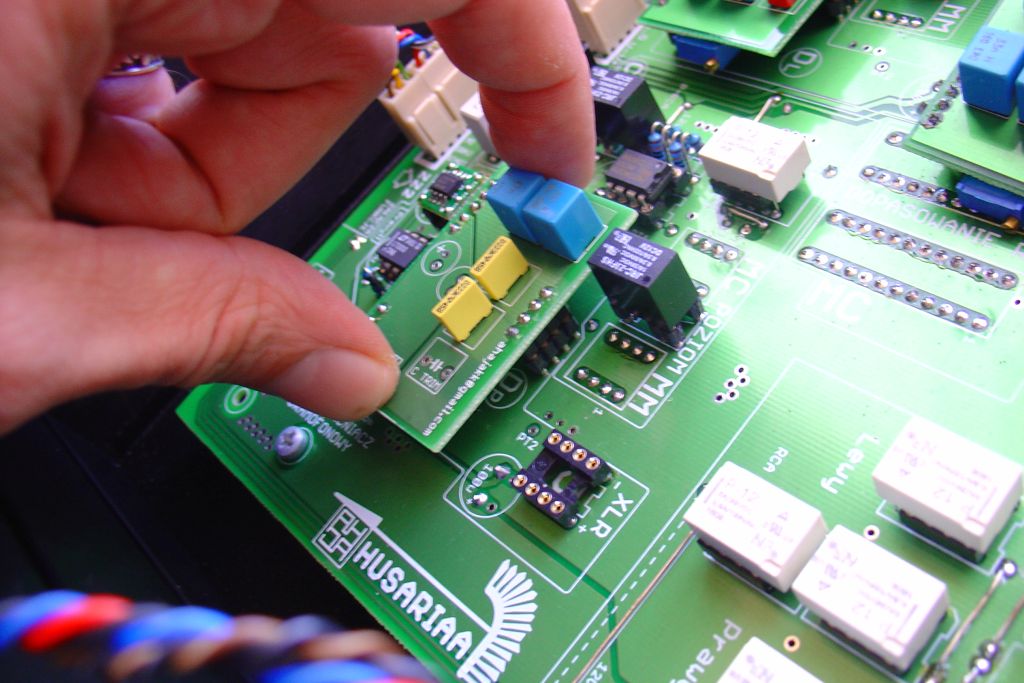 7.Chwytamy dwoma palcami małe pcb po krótszych bokach i równomiernie, powoli wyciągamy z podstawek. Tak wyciągamy obydwie płytki z pcb głównej.