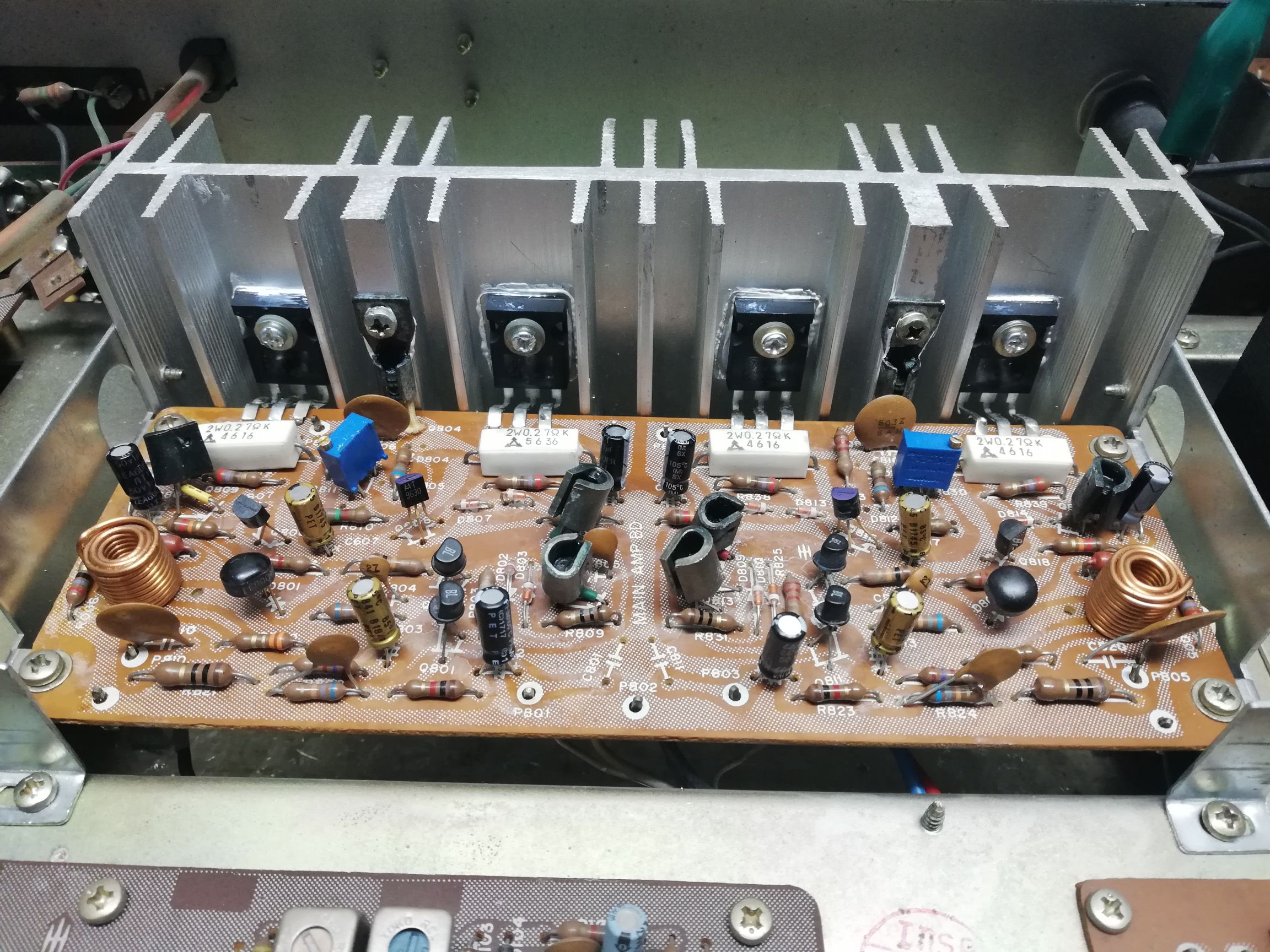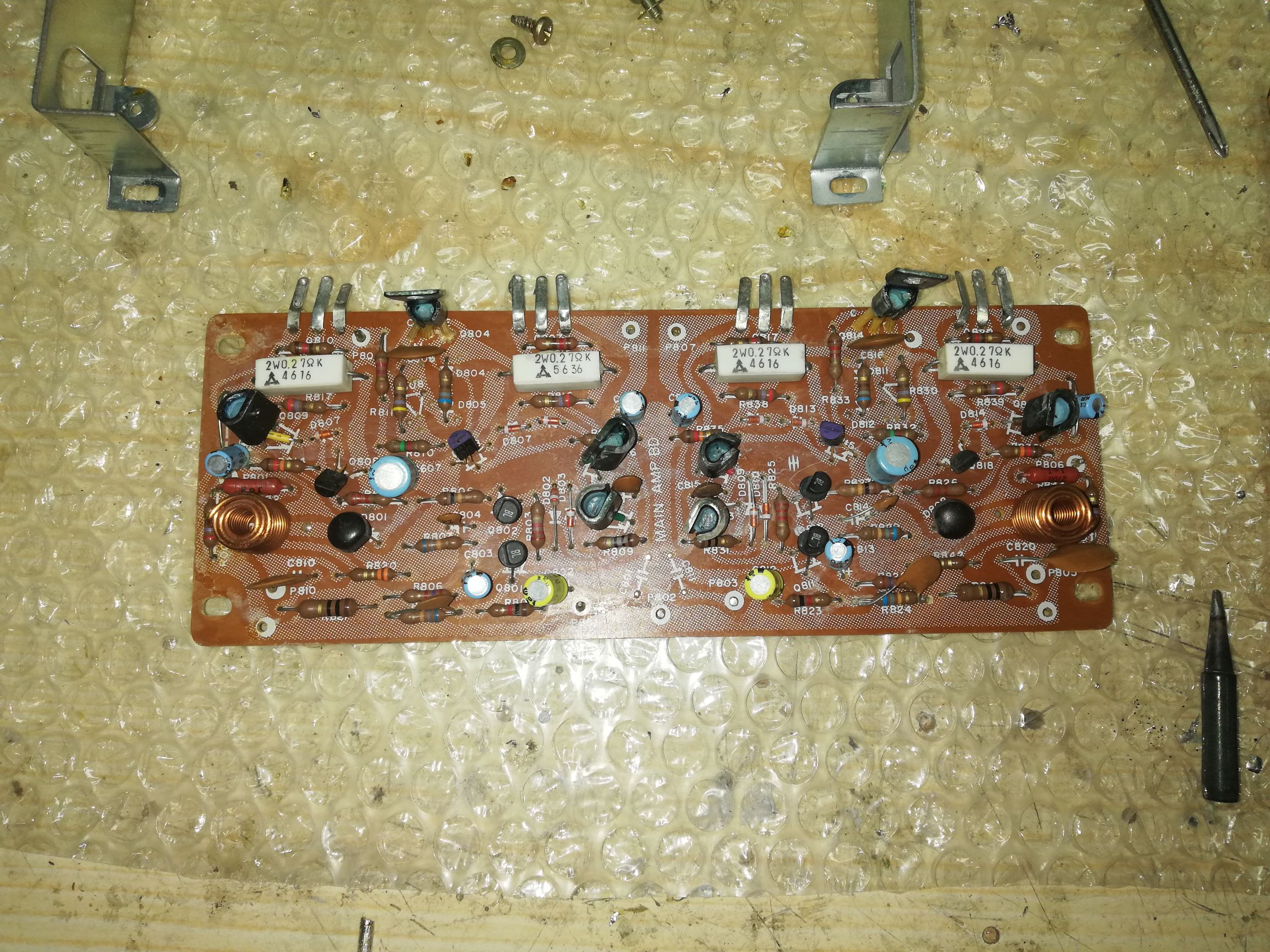 Na trójkącie przy małym sygnale wyjściowym spróbuję wyregulować prąd spoczynkowy na min. Zniekształcenia skrośne... Chyba że coś jeszcze padło...np. tranzystory sterujące... Może też je sprawdzę :think:
