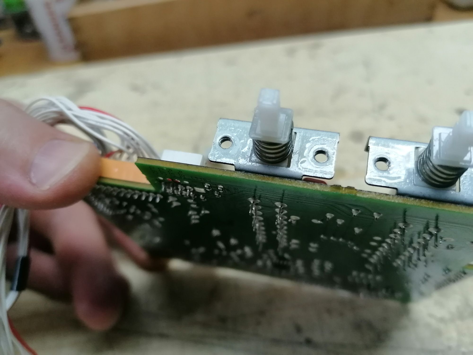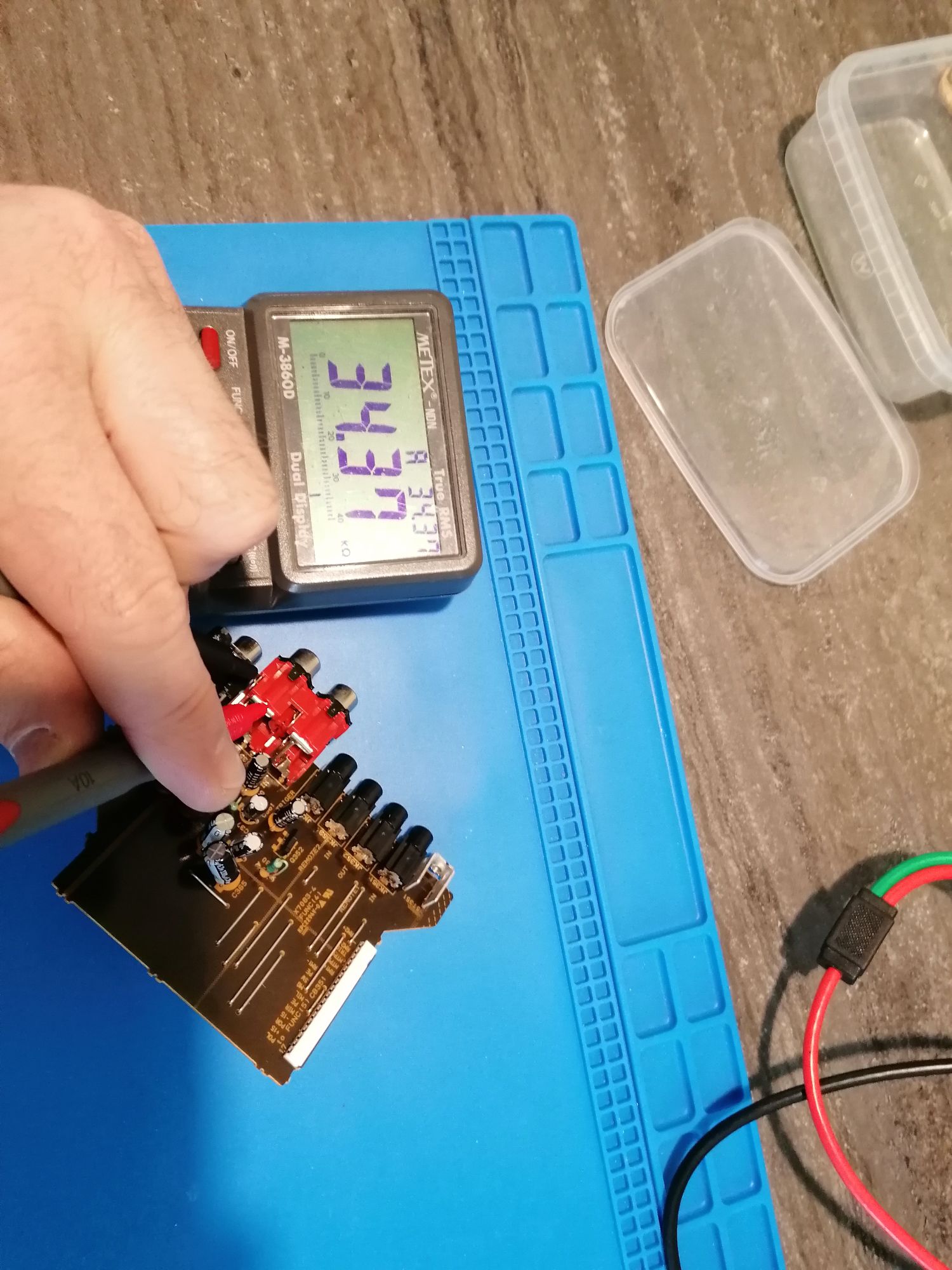 Deszczowa majówka... Ogarnołem te przełączniki, dosyć trudne, bo trzeba suwaczki razem ze sprężynkami montować i trochę brakuje trzeciej ręki, dla początkujących nie polecam się za nie brać. Rezystor wywaliłem bo widać że na Janusza wlutowany. Dosyć długo nie mogłem nic mądrego znaleźć bo mierzyłem względem masy głośników, i wszędzie pokazywało ten prawy że jest źle... Przepiołem masę na obudowę i szybko trafiłem problem na płytce pre out...
