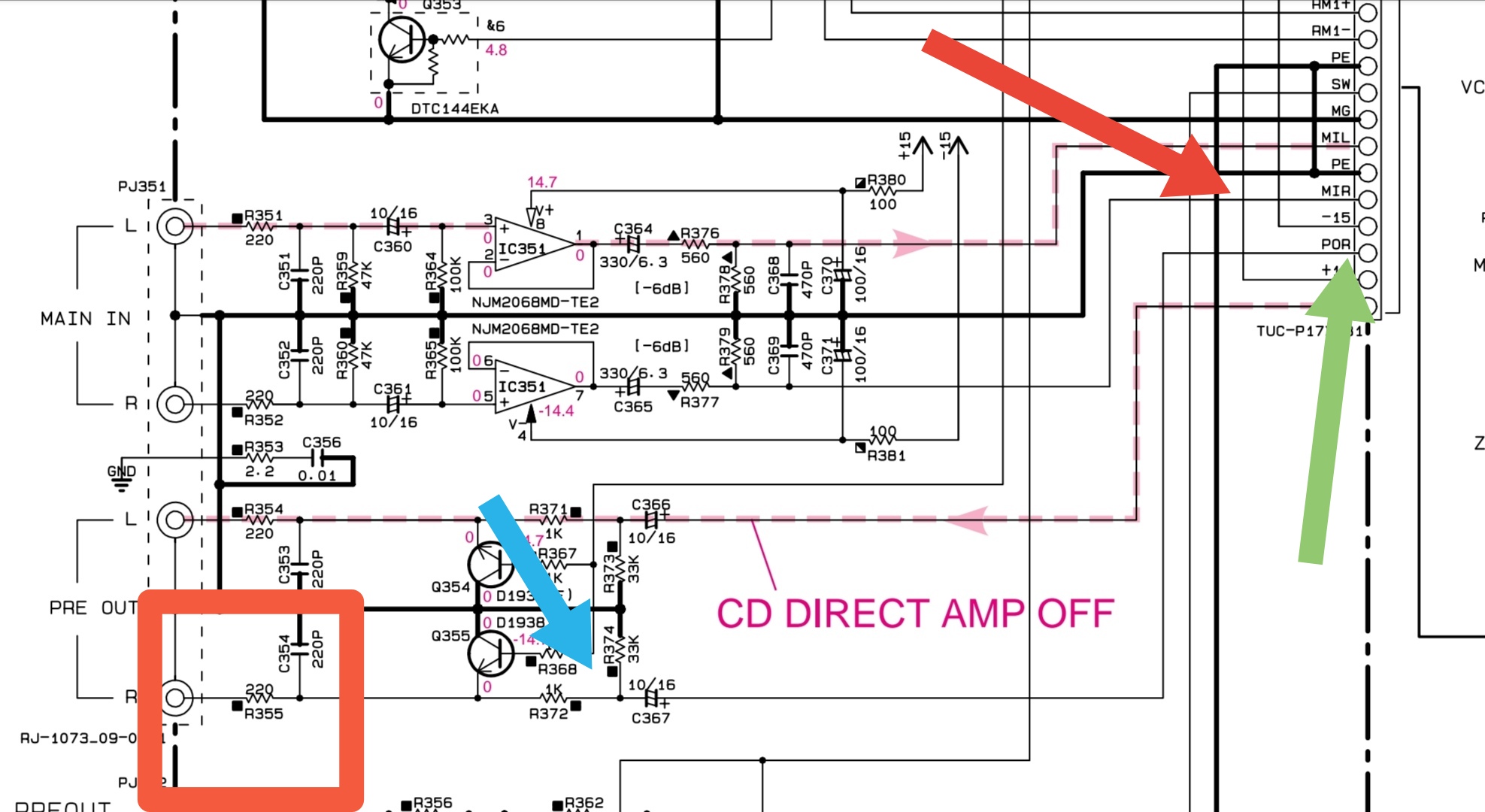 Sygnał wchodzi POR jest ok. I da się regulować balansem, ale już na wyjściu MIR jest kaszana... Za kondensatorem c367 już się krzaczy... Płytka wyleciała na obdukcję...