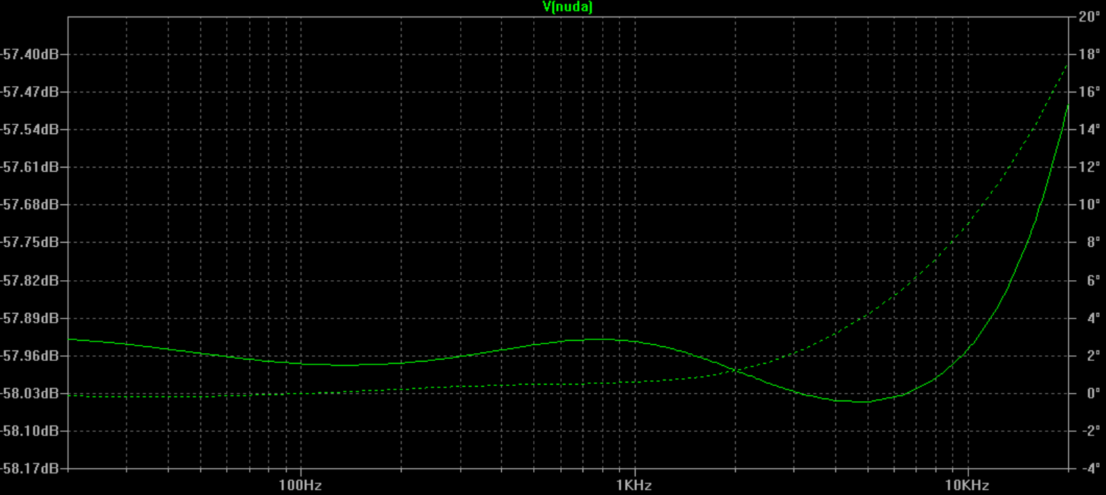 a błąd maksymalny wynosi 0.78% - nieco gorzej ale wciąż nieźle. Dla porównania AVT1693 ma błąd średni 0.3% a maksymalny 0.56%. Poniżej odpowiedź częstotliwościowa NUDY na sygnał INV_RIAA (czyli odwrócone RIAA):