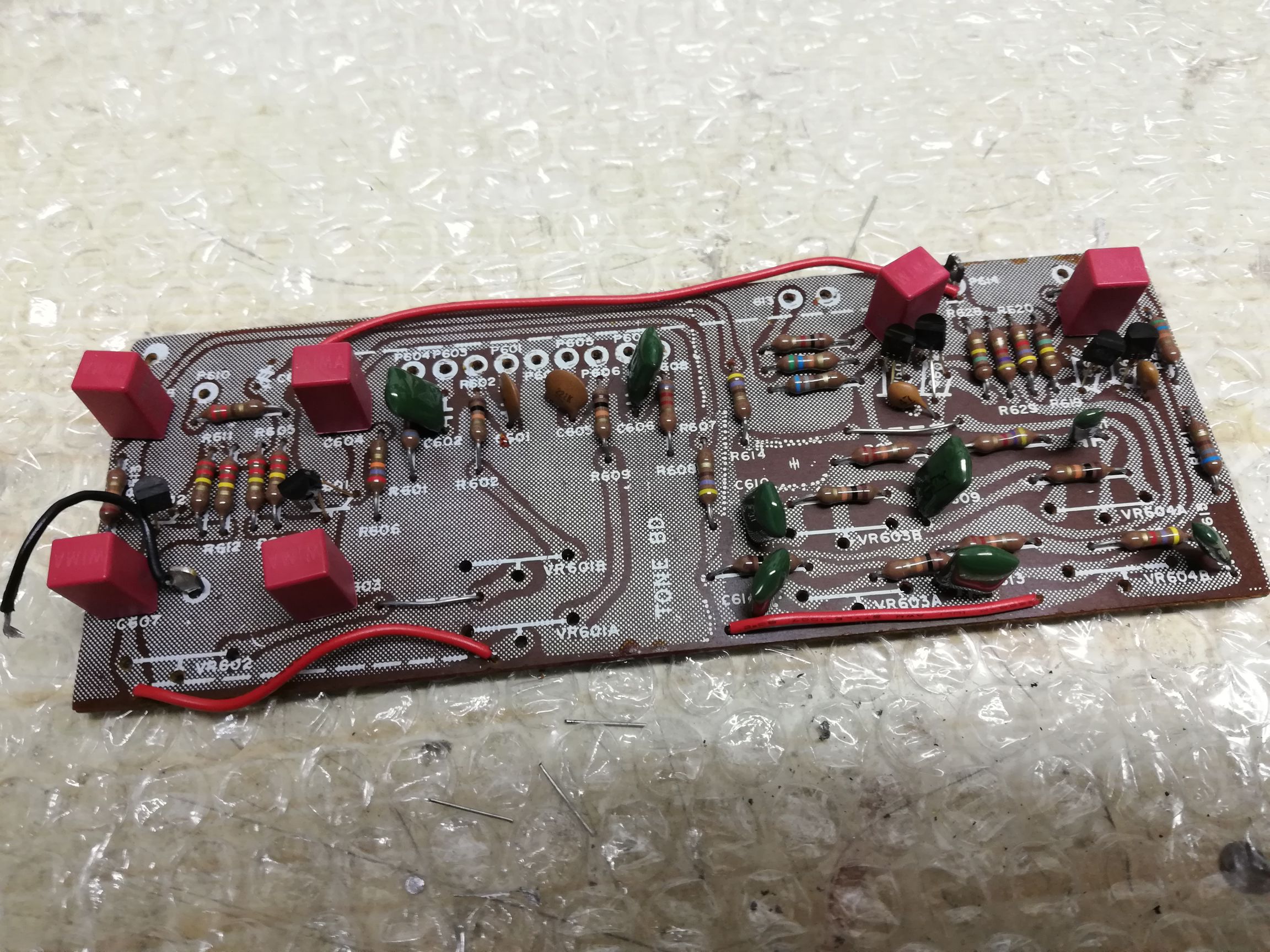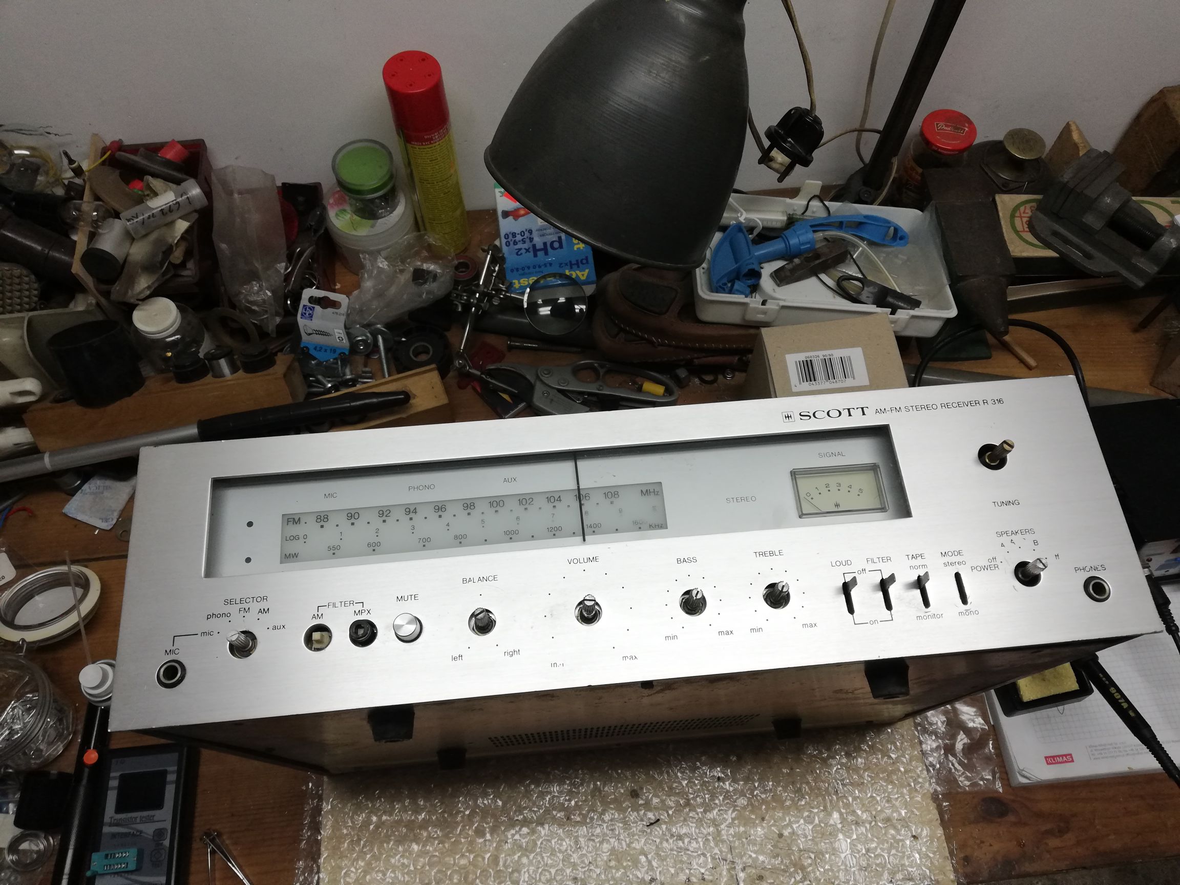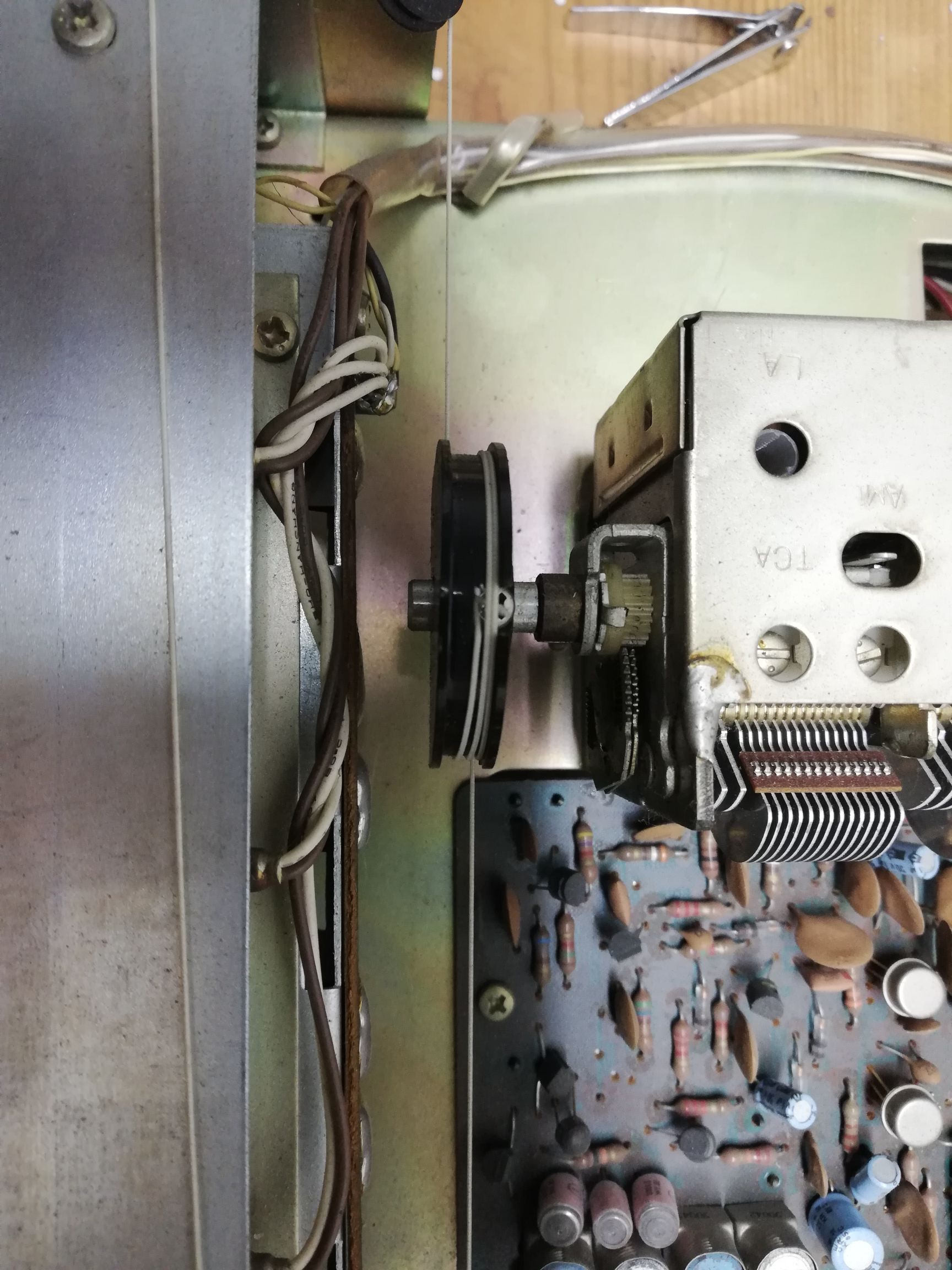 Elektrolity wymieniłem wszystkie oprócz płytki AM, Żarówki wymienione, schemat podaje żarówki 12v nad wskaźnikami ale zasilanie jest 7v więc ich nie widać, wstawiłem tam zarowki 8v... uszkodzony był jeszcze wskaźnik sygnału skala się obsunęła i opierała się na wskazówce... Wymieniłem z dawcy