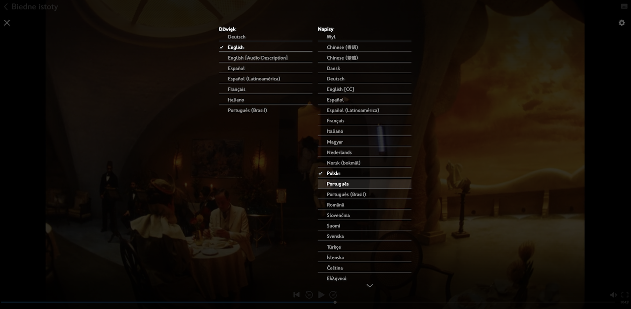Każdy film po uruchomieniu ma możliwość zmiany języka dźwięku lub napisów, jest do tego specjalna ikona, którą trzeba wybrać. W przeglądarce to jest prawy górny róg filmu. W aplikacji na Android TV jest chyba zaraz nad paskiem postępu filmu.