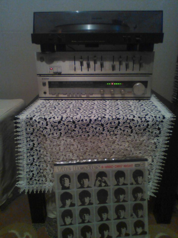 "Z ojcem naprawiliśmy gramofon! :D Wszystko działa poza detalami (np. światełka na wzmacniaczu). Właśnie leci "Tell Me Why" z ruskiego wydania "A Hard Day's Night" Beatlesów "