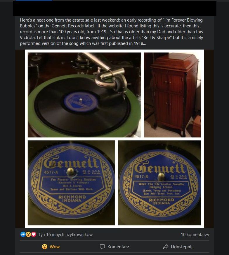 Takie coś, z grupy na FB. Płyta z 1919 roku, starsza od gramofonu na którym się kręci.