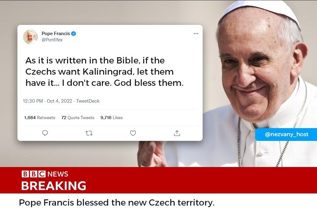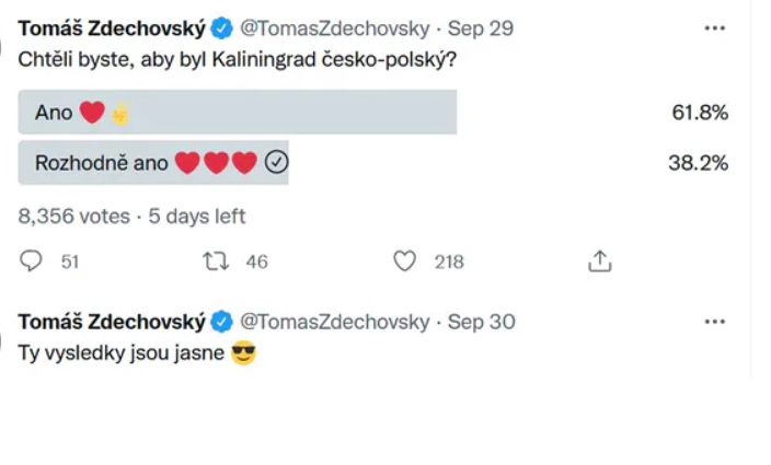 kinky pisze: ↑04 paź 2022, 17:27Nie wiem czy słyszeliście, że Czesi zakpili z ruskich referendów w UA i rozpisali referendum za przyłączeniem Kaliningradu do Czech. Powołali się na to, że Kaliningrad został założony na cześć czeskiego króla Przemysła Ottokara II, Oczywiście je wygrali, ale teraz jeszcze proponują obwód Kaliningradzki podzielić między PL i CZ.