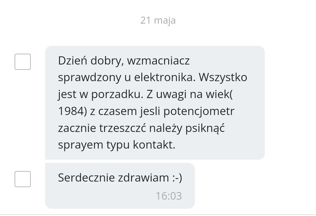 "Dzień dobry, potencjometry i przelączniki nie trzeszczą. Wszystko jest ok. W weekend sprawdzę na kolumnach. Serdecznie zdrawiam