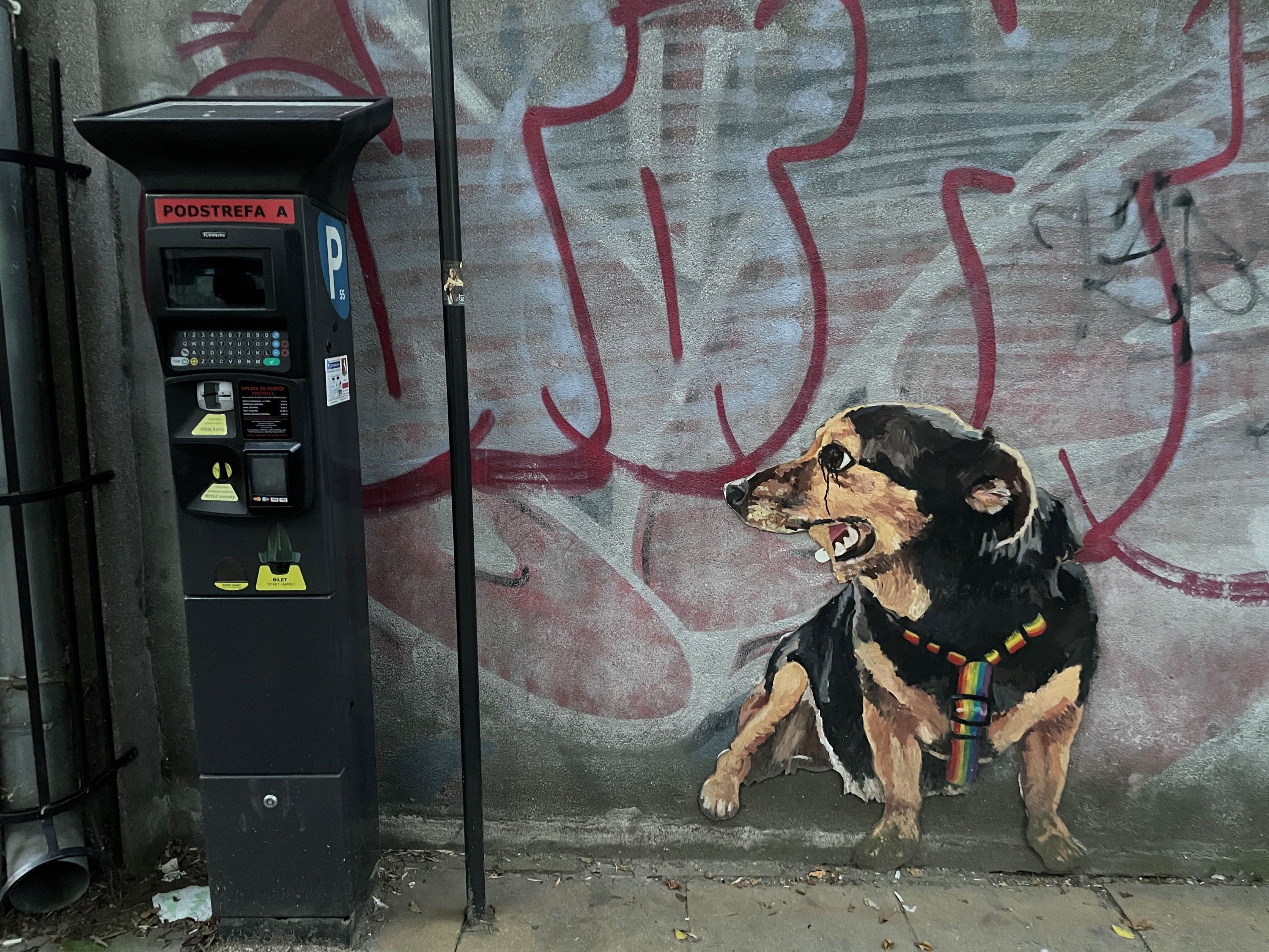 Pies wkurzony na opłaty parkingowe:) tylko dlaczego ma opaskę w tęczowych kolorach? po co mieszać w to niczemu winne zwierzęta.