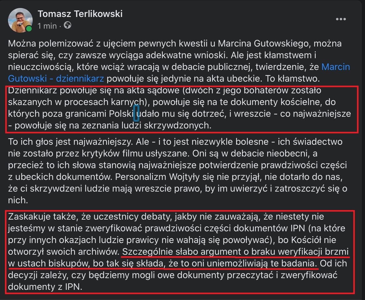 Jestem ostatnią osobą, jaka twierdziłaby, że Gutowski powołuje się li tylko na źródła UB. Tak oczywiście nie jest. Ogólnie wszystko to racja, ale mnie chodzi o rolę bp. Wojtyły w tym wszystkim. Co on wiedział, jak na to zareagował, czego nie musiał wiedzieć, czego prawdopodobnie nie wiedział, a czego wiedzieć nie mógł. Czy w tej sprawie dochowano rzetelności dziennikarskiej, czy też spekulowano "wiedział, bo musiał wiedzieć", tak jak wcześniej spekulowano o późniejszych czasach, w których Wojtyła był już papieżem. Bo że były skandale pedofilskie i że wiele z nich tuszowano, nie mam najmniejszego zamiaru kwestionować. Ale w dużych instytucjach każda wiadomość idzie przez wiele biurek i na więcej niż jednym z nich może zostać zatrzymana.