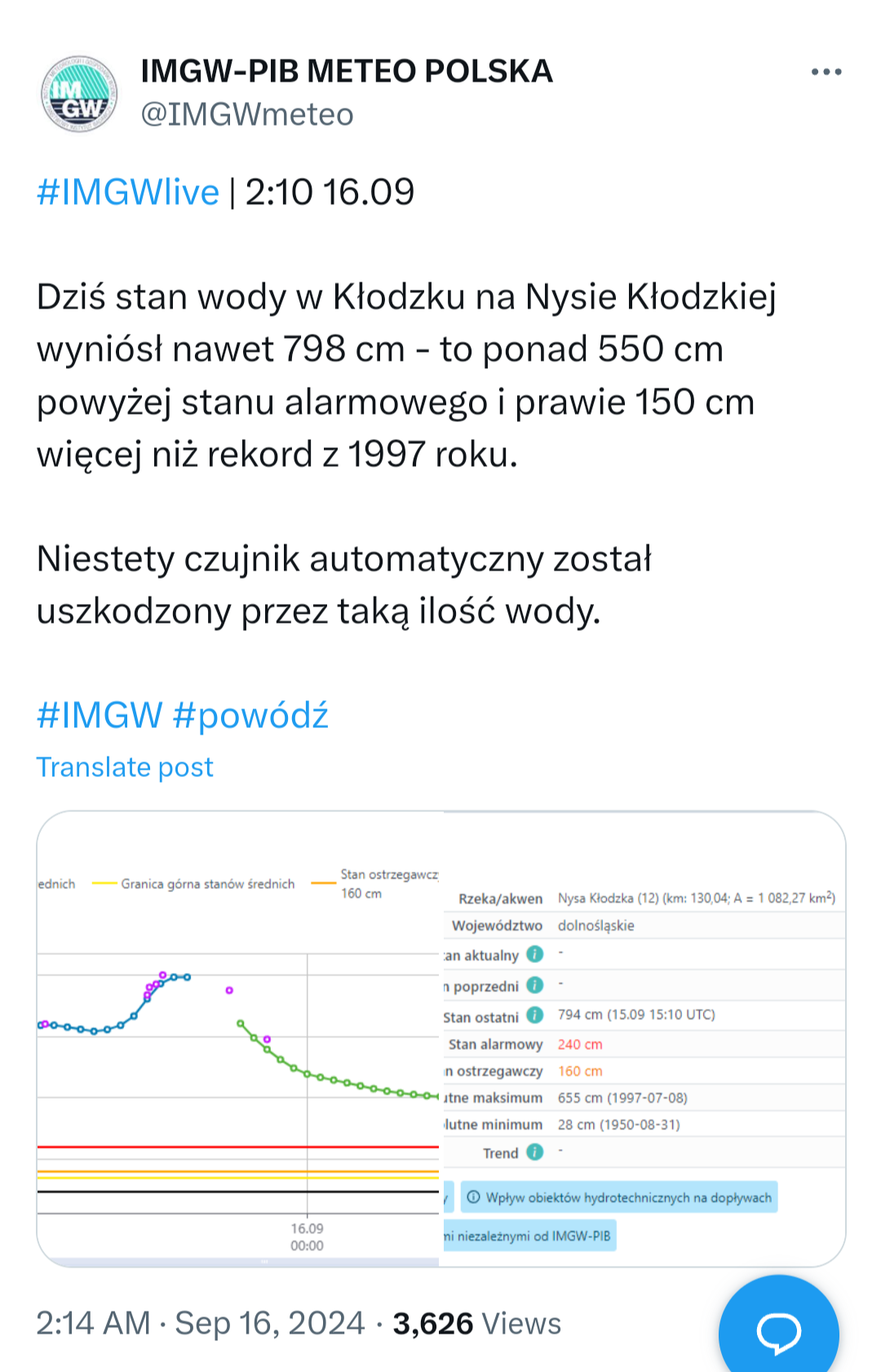 W Kłodzku już spada ponoć, przez Bardo się przetacza fala ze Stronia, DK8 zamknięta. Prawie przelewa się już przez mosty, poziom chyba wyższy niż w 97...