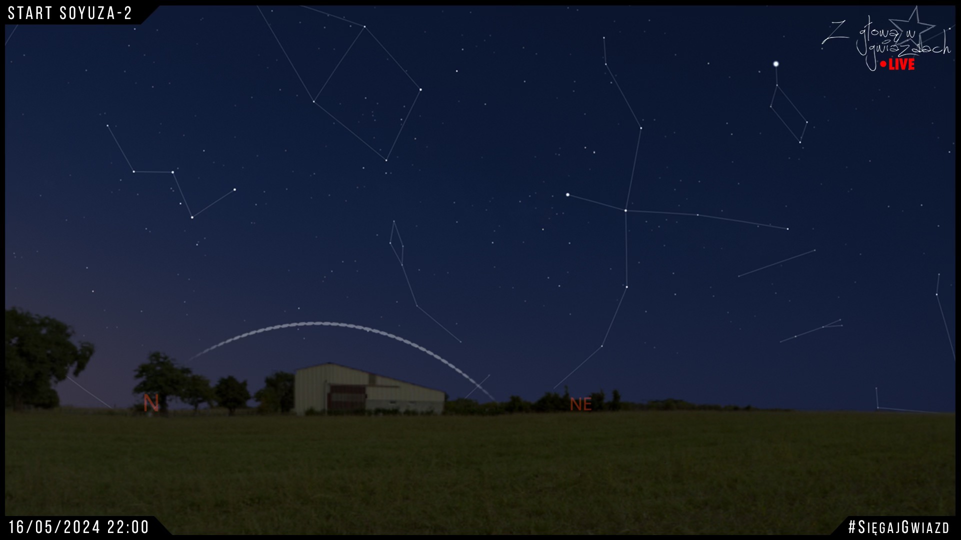 Ruskie ok. 22 planują start rakiety z kosmodromu na południe od Archangielska. Możliwe, że będzie widać jej gazy wylotowe podświetlone światłem słonecznym nad północnym horyzontem, najlepszy widok z północnej Polski, im dalej na południe tym widoczność gorsza lub wcale. Prawdopodobna trajektoria i możliwy widok po starcie:
