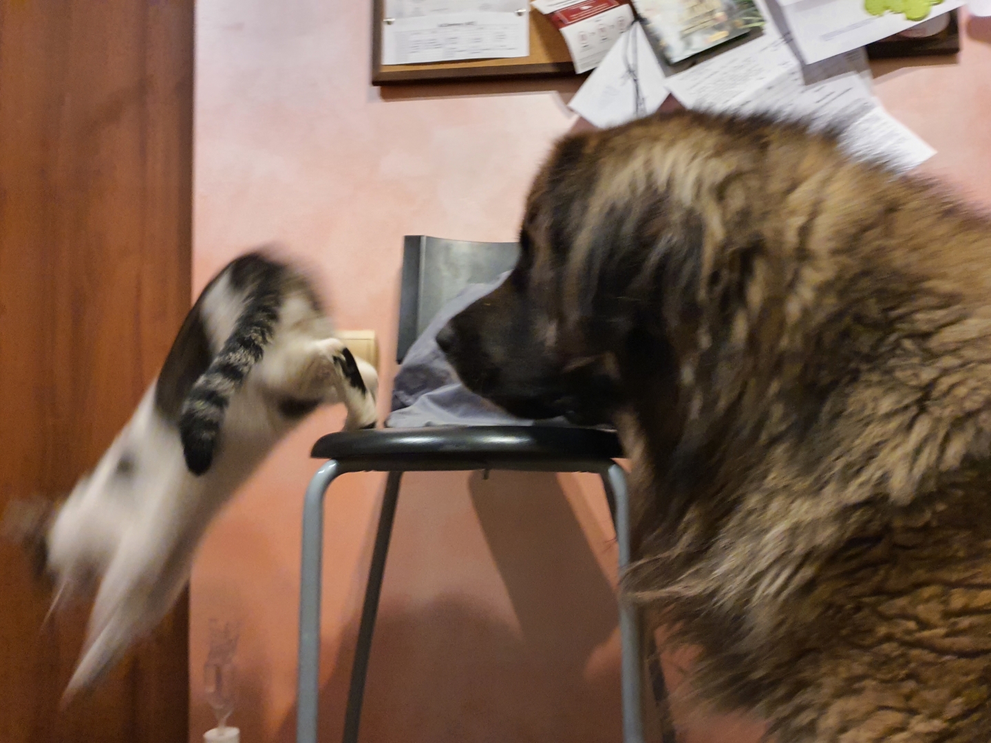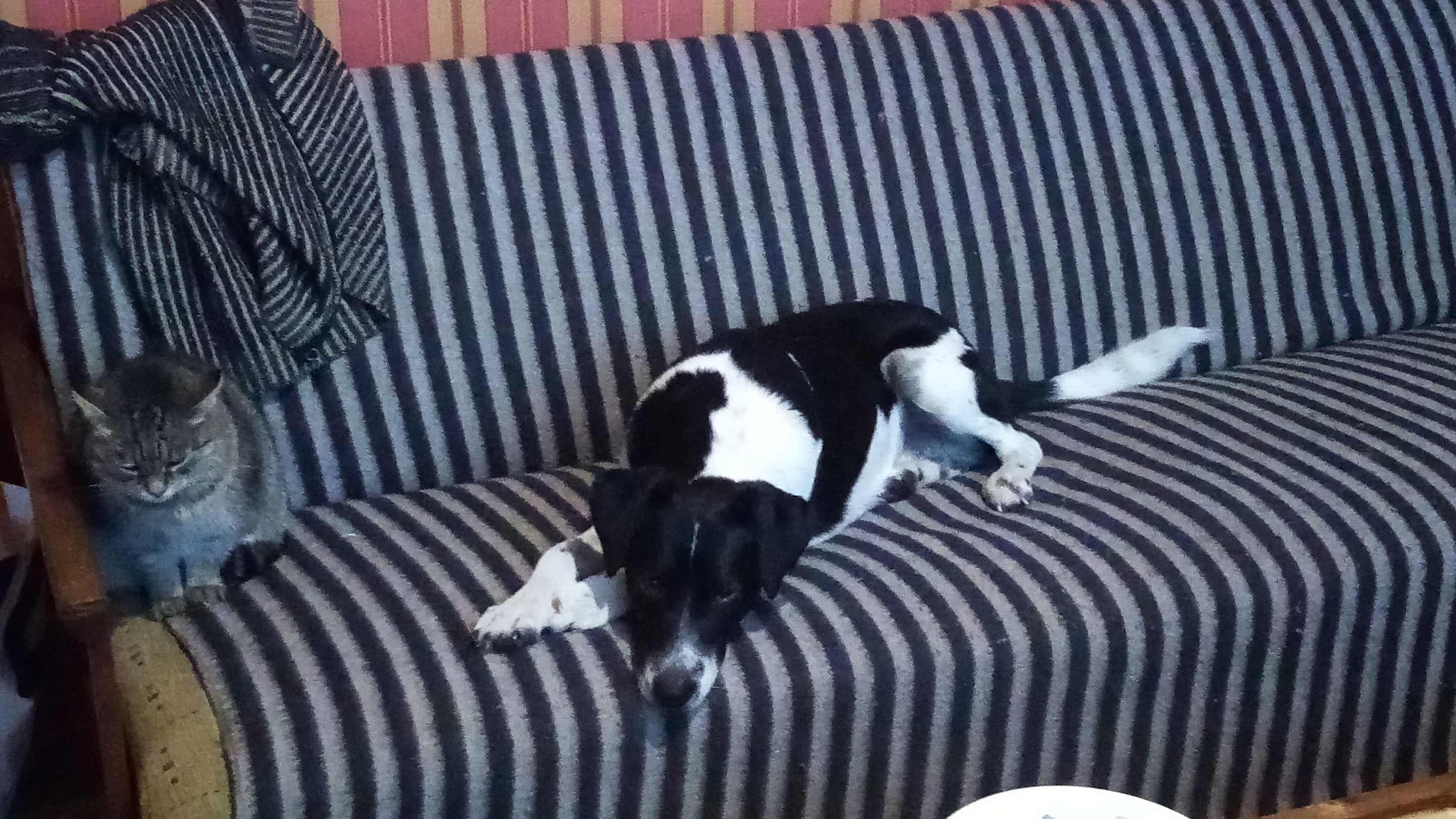 Pies wygonił kotkę na dwór i zajął jej miejsce. Jak zrobiło się zimniej to kicia przychodzi się ogrzać lecz pies nie daje za wygraną i ją ściga, w efekcie dostaje po nosie pazurami (chyba lubi). Czasem zdarzy się cud jak przed chwilą który mógłby już tak zostać. :)