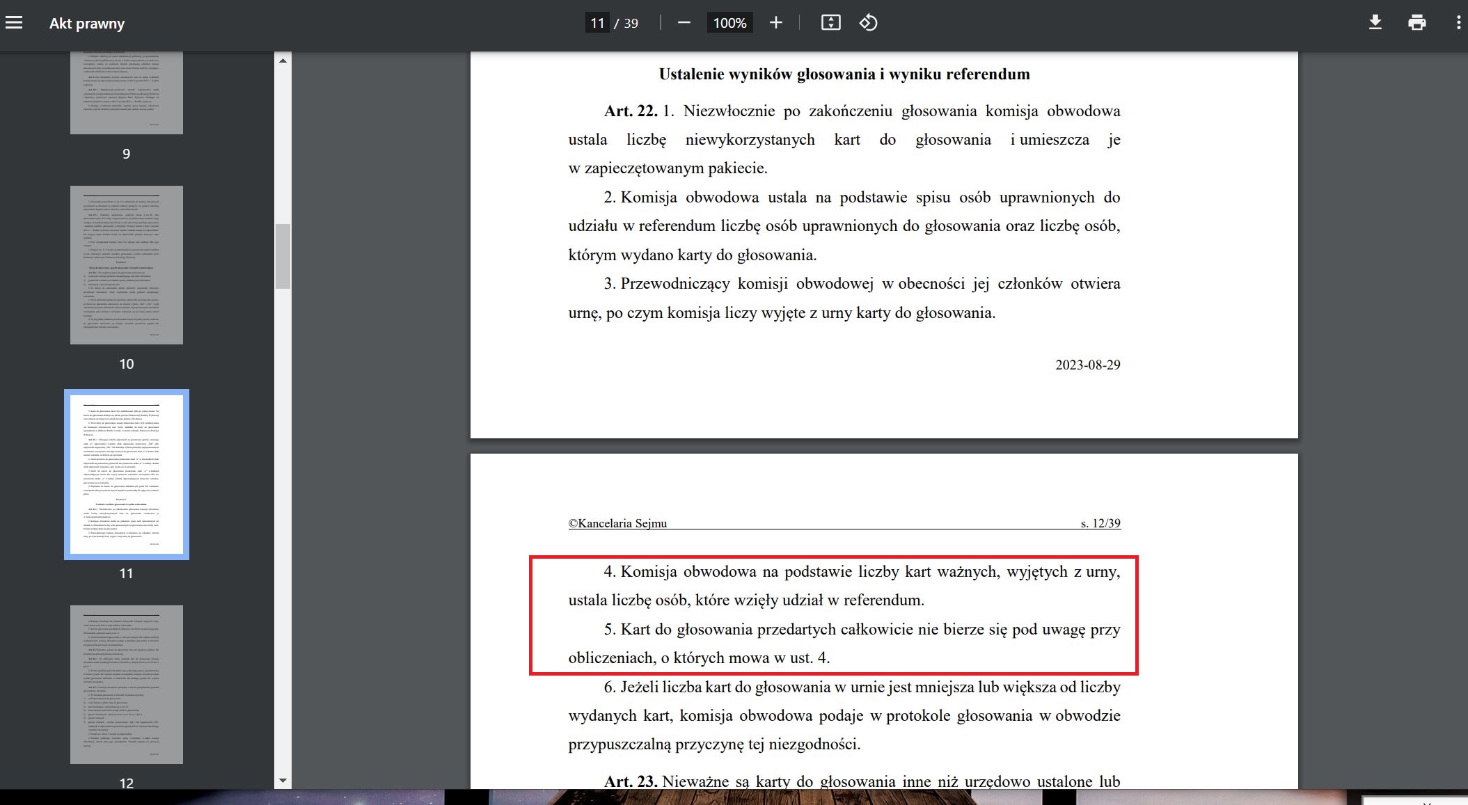 Kart przedartych całkowicie nie bierze się pod uwagę do ustalenia frekwencji (Art. 22.5).