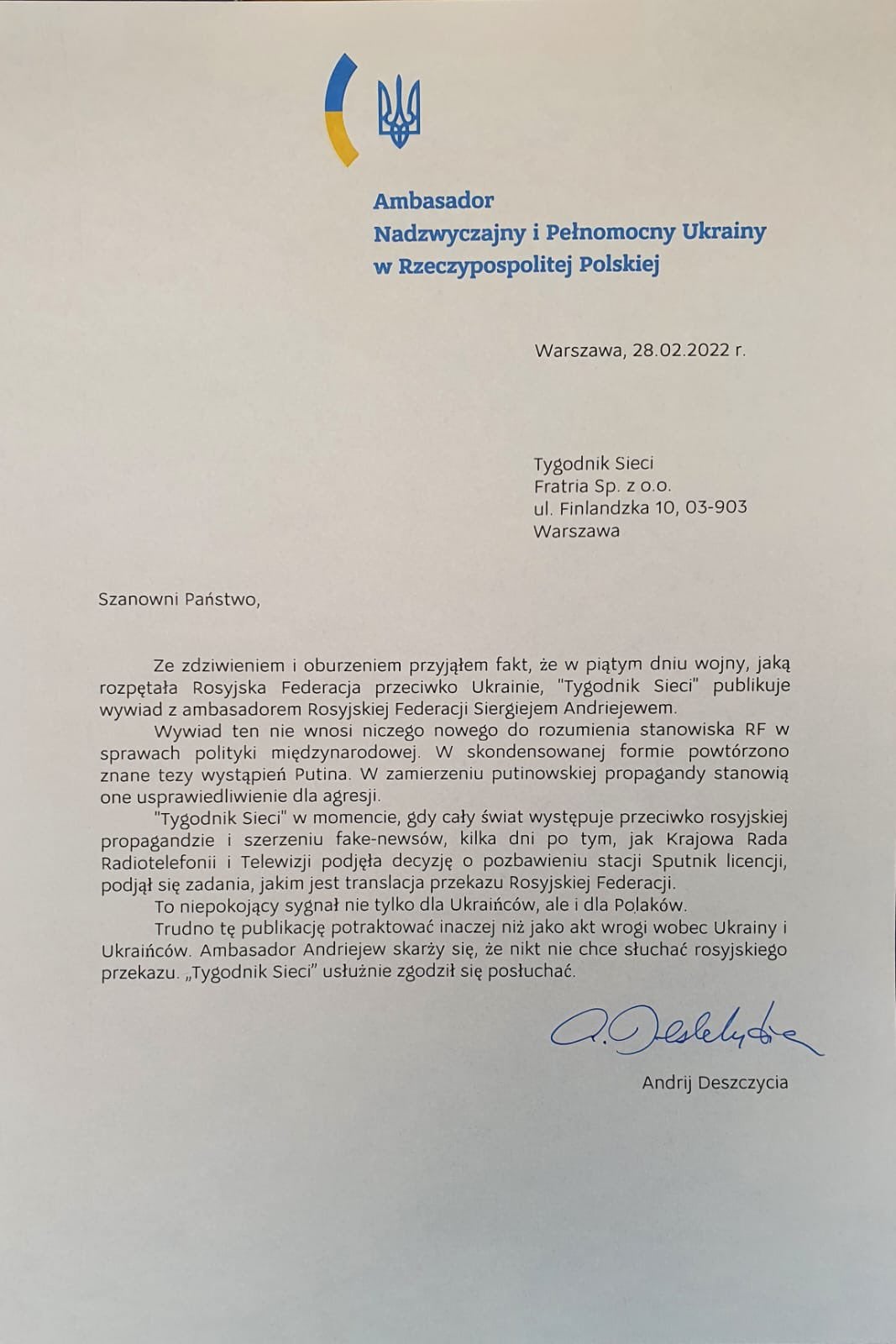 "PAP: Od dawna mądrzy ludzie przestrzegali, że z Putinem, z Rosją, nie wolno się cackać, zapraszać na europejskie salony, traktować jak partnera, gdyż będzie to przyjmował jako wyraz słabości."