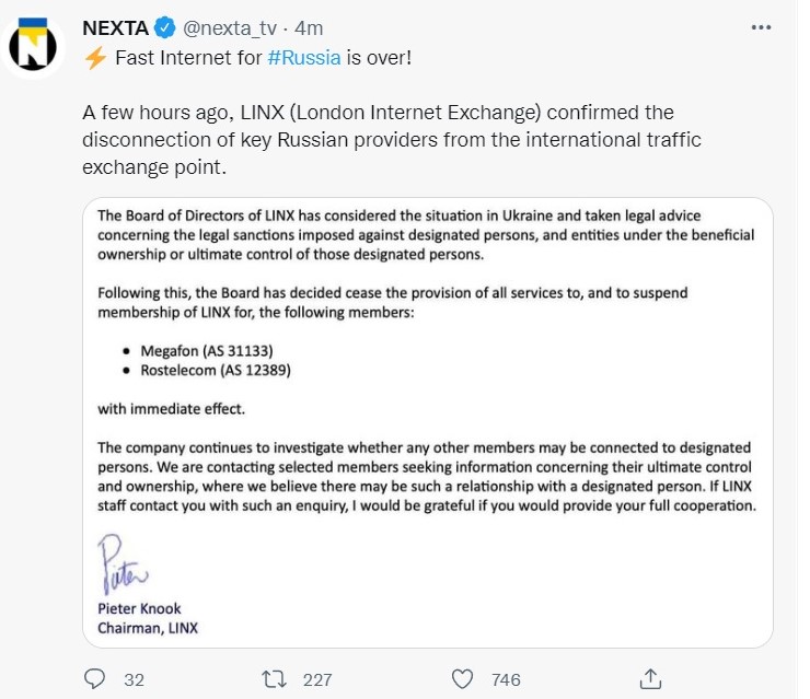utrudniłoby gdyby Telia ich wycięła ale to bardzo mało prawdopodobne, pozostaje odfiltrowanie po AS na BGP, u mnie w firmie już to nastąpiło jakiś czas temu- klientela zauważyła że nie działają jakieś jednostkowe ruskie stronki (abonenci ze wschodu) a tak to cisza generalnie