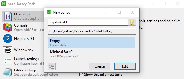 Po instalacji otwieramy. Klikamy na nowy skrypt i wpisujemy sobie: myslnik.ahk
