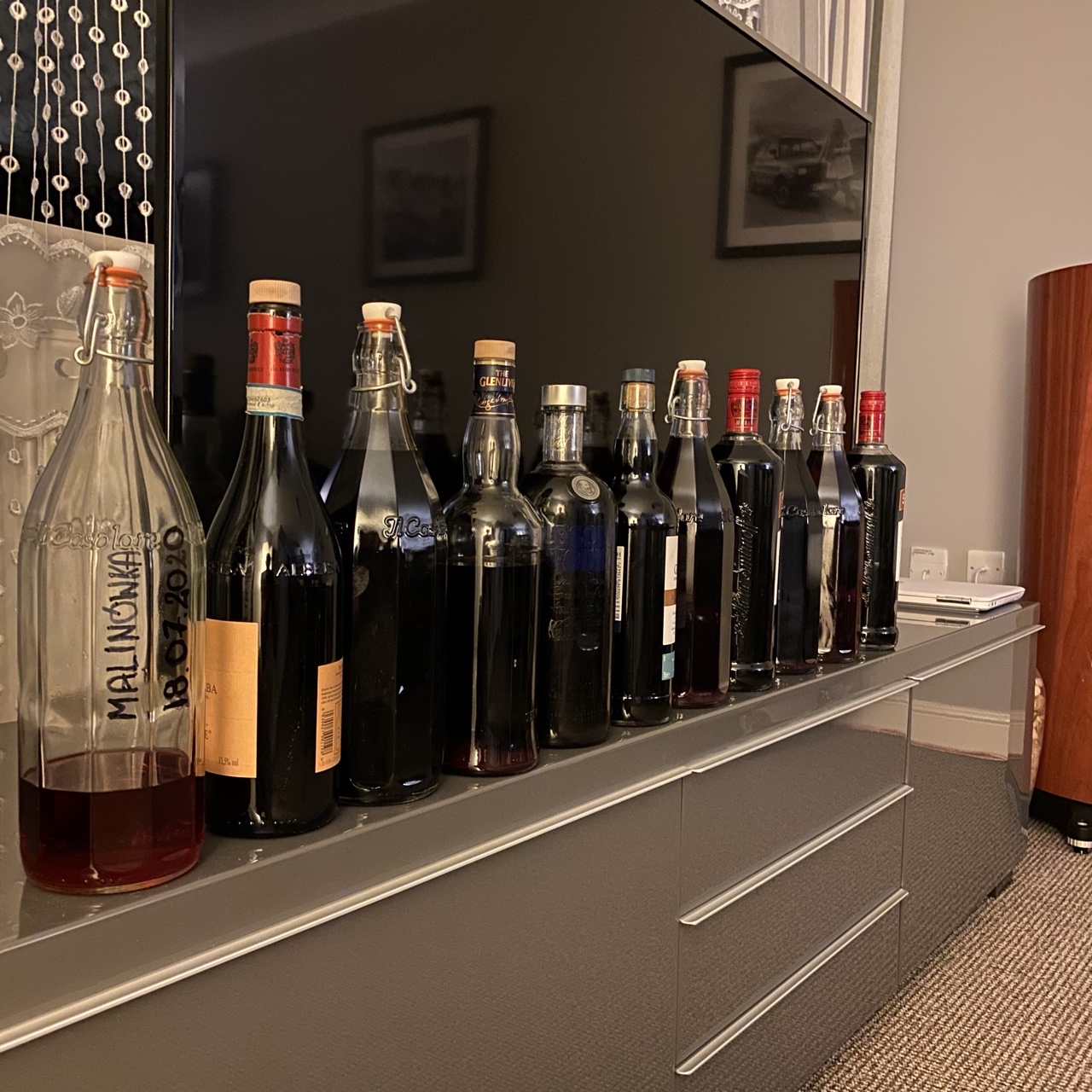 Tak chwilowo (bo w butelkach tymczasowych) wyglada moja tegoroczna produkcja. Malinka, orzeszek, jeżyna i dojdzie pigwa... Jak się wyklaruje to za parę miesięcy zleję do ładniejszych.