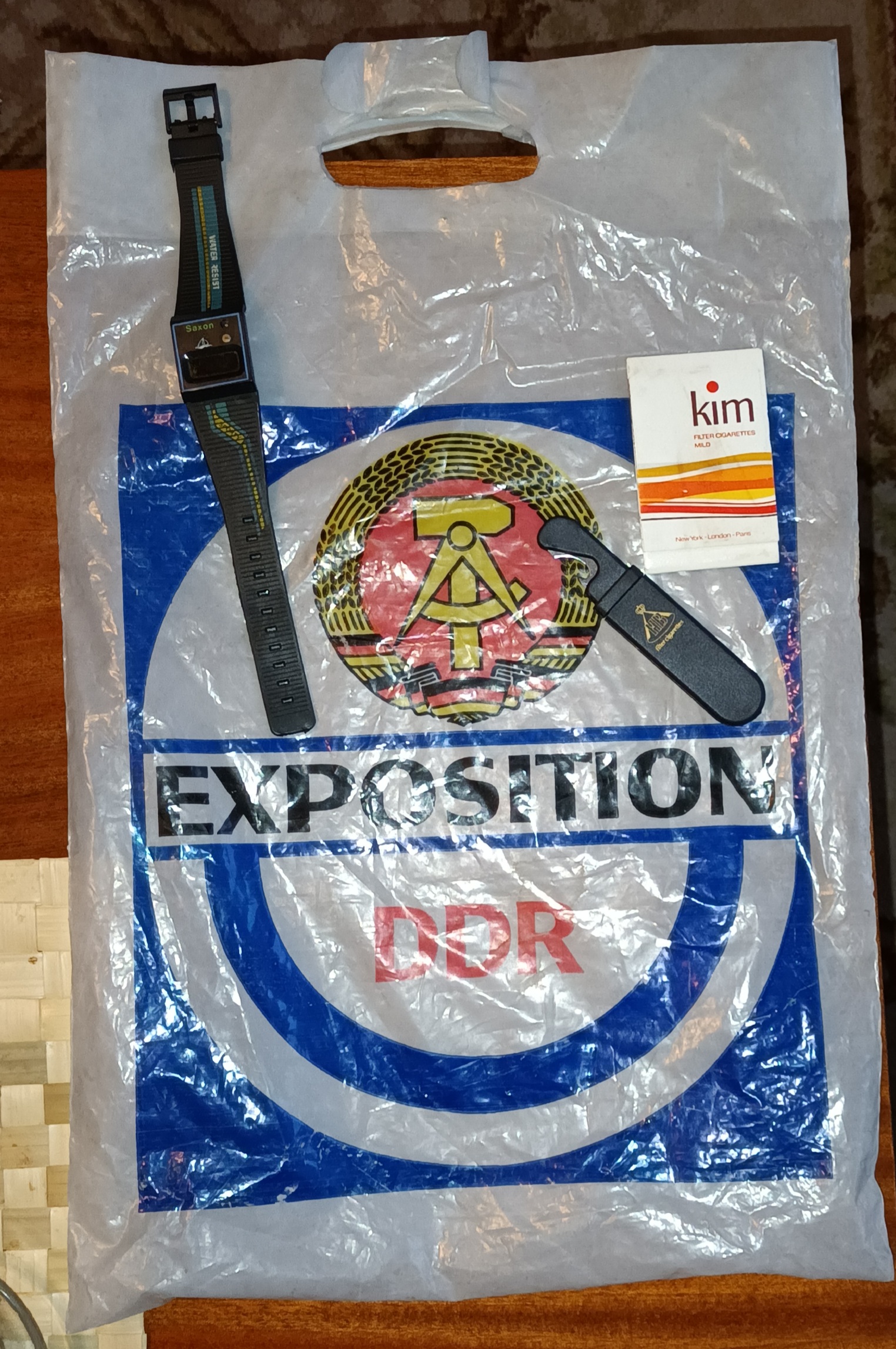 Torba reklamowa z pawilonu NRD, pilniczki do paznokci jako reklamówka papierosów KIM i nożyk otwieracz z HB, jeśli ktoś nie pamięta, to była taka marka papierosów. Ktoś to z domowników do domu przyniósł. Takie to były zdobycze. Przynosiły wiele radości, bo w sklepach wówczas hulał wiatr.