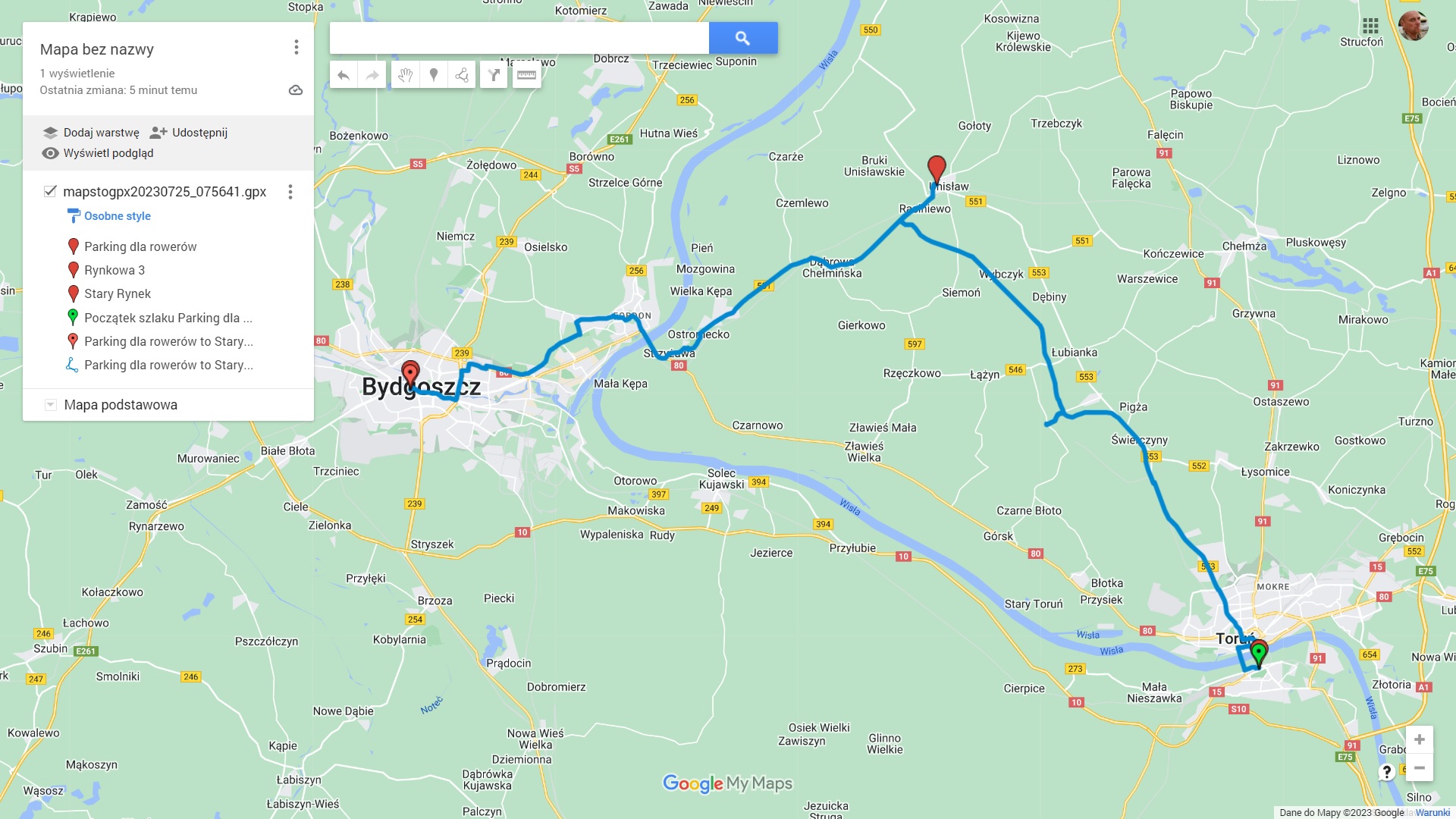 Zrobiłem, proszę bardzo dla każdego natomiast jak pisałem zdecydowana większość trasy jest dobrze oznakowana. Prawdopodobnie łatwiejszą trasą byłaby odwrotna czyli Bydgoszcz Toruń i powrót z Torunia (wiatr).