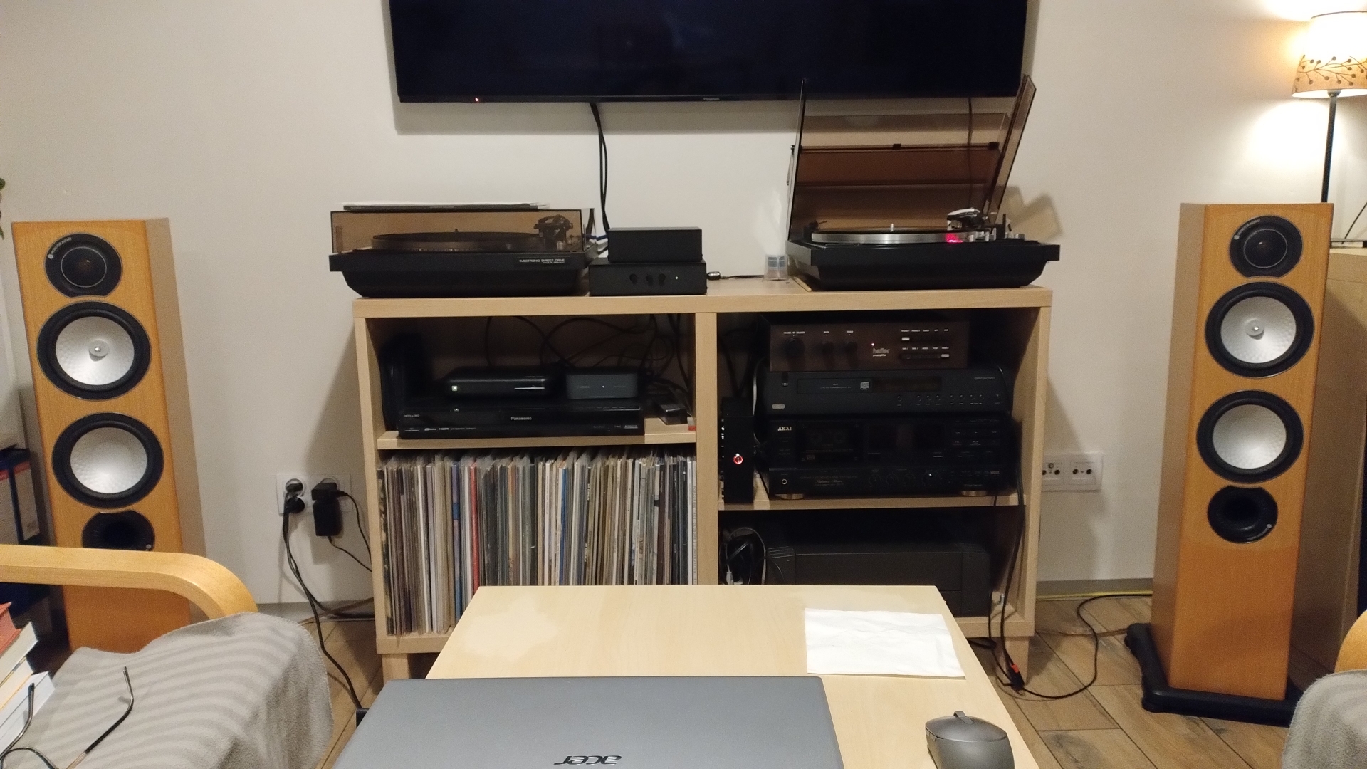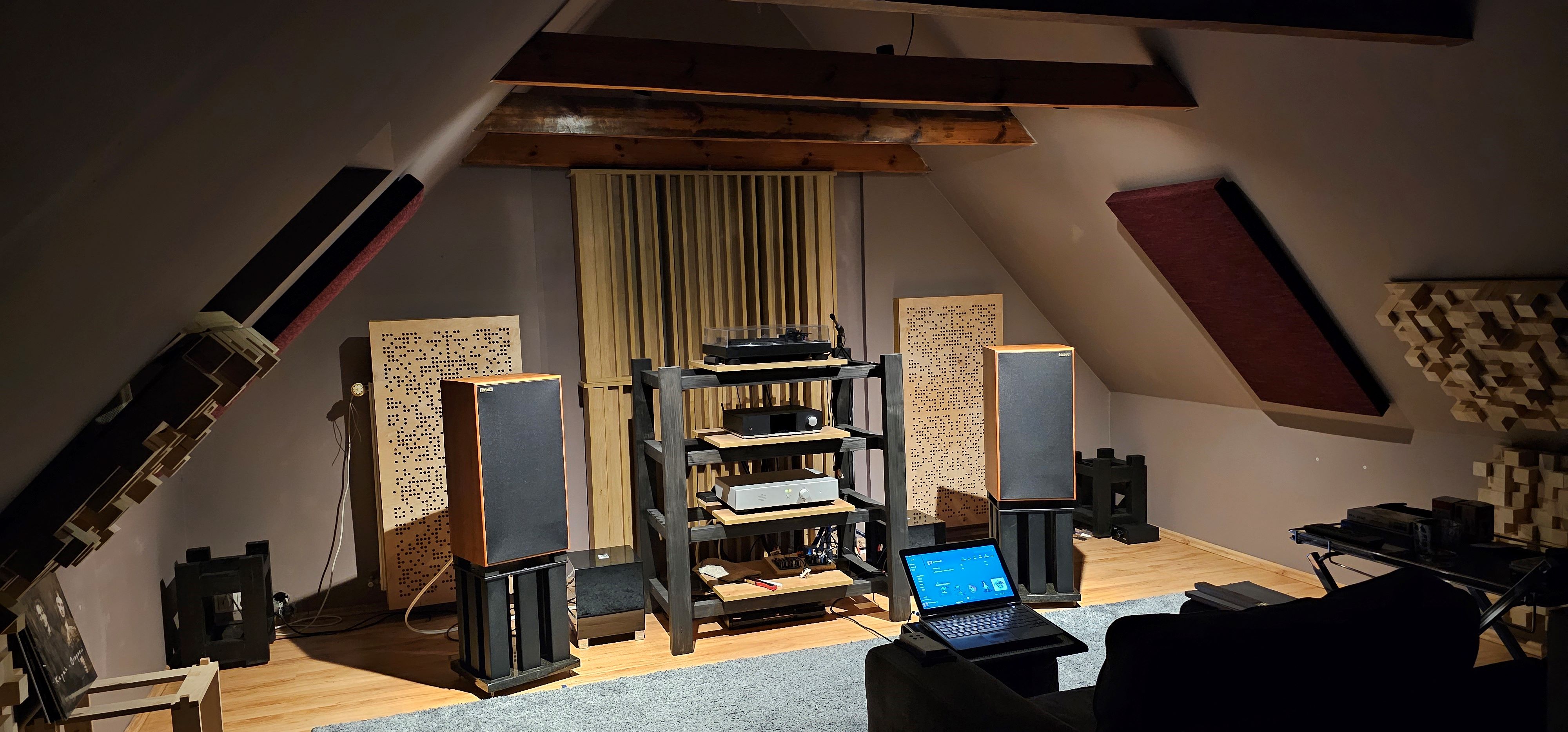 Dużo się namęczyłem z tym poddaszem ale warto było dzisiaj już bym nie wrócił do salonu w tej chwili słucham muzyki jakbym był w kameralnym klubie na koncercie jazzowym. To nie jest pokój idealny ale nim być nie może płyta karton gips do tego skosy ale słucha się w nim naprawdę przyjemnie