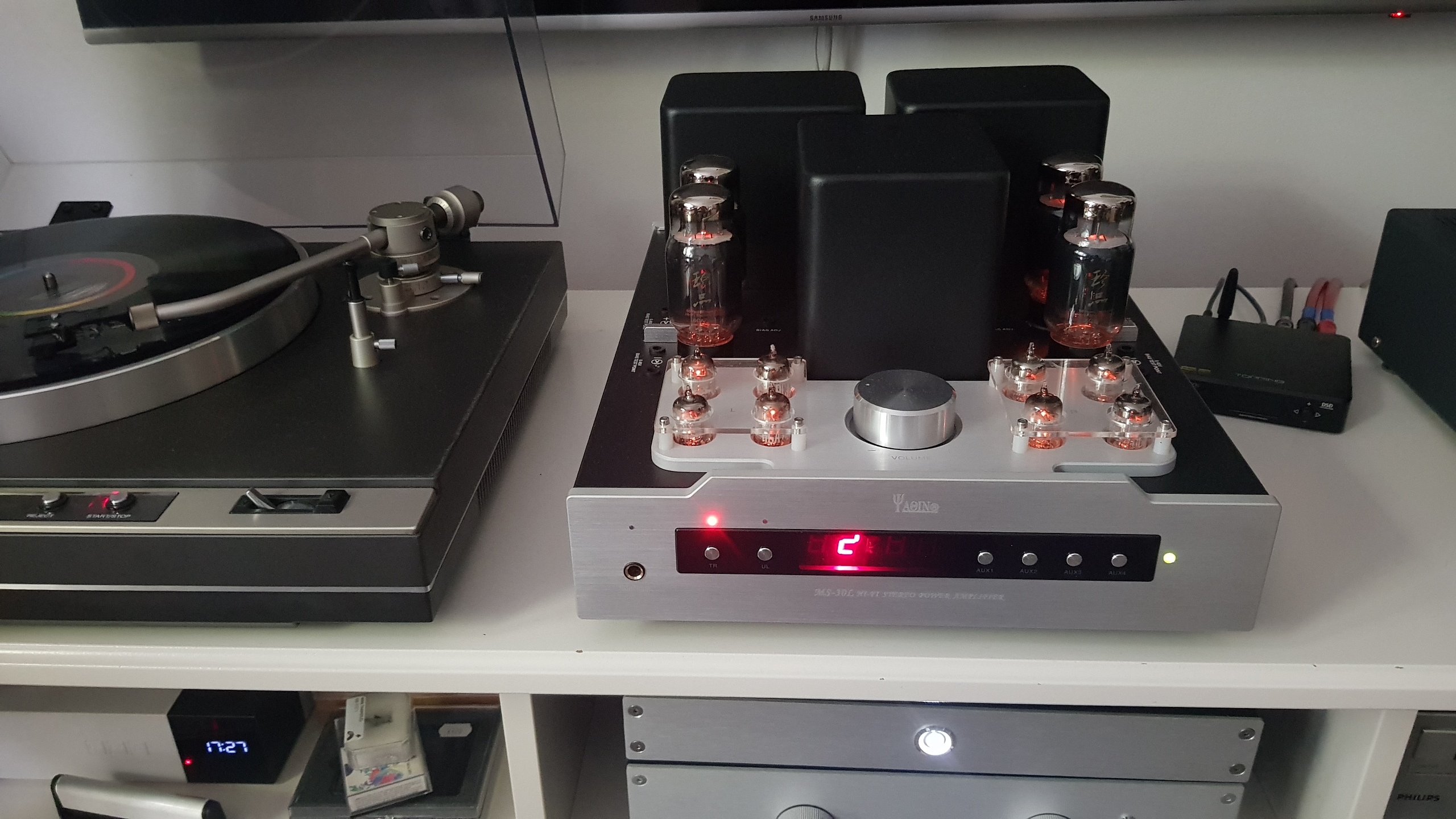Z ciekawości odpaliłem na podstawowych chińskich lampkach. Wiem, że lampa musi się trochę wygrzać, ale po dwóch utworach wyłączyłem wzmacniacz. Wąska scena między kolumnami. Na plus ładna niebieska poświata. Załadowalem Matsushity 6CA7. 2, 3 utwór, doleciałem do 13 i jest banan nie shcodzi z twarzy. Scena jest szeroka. Średnica z ładną barwą, bas obecny, nie nachalny, góra delikatnie zaznaczona.