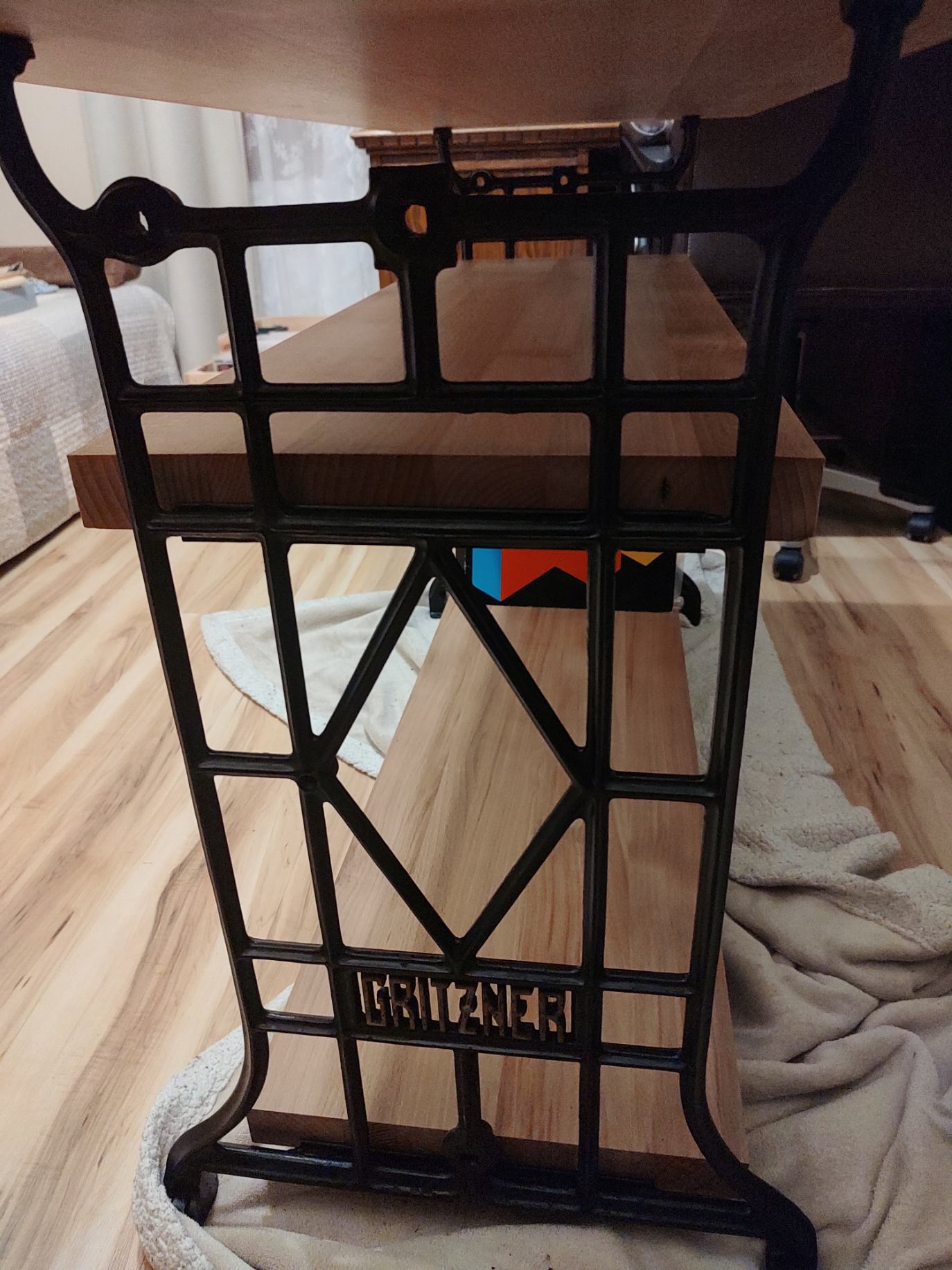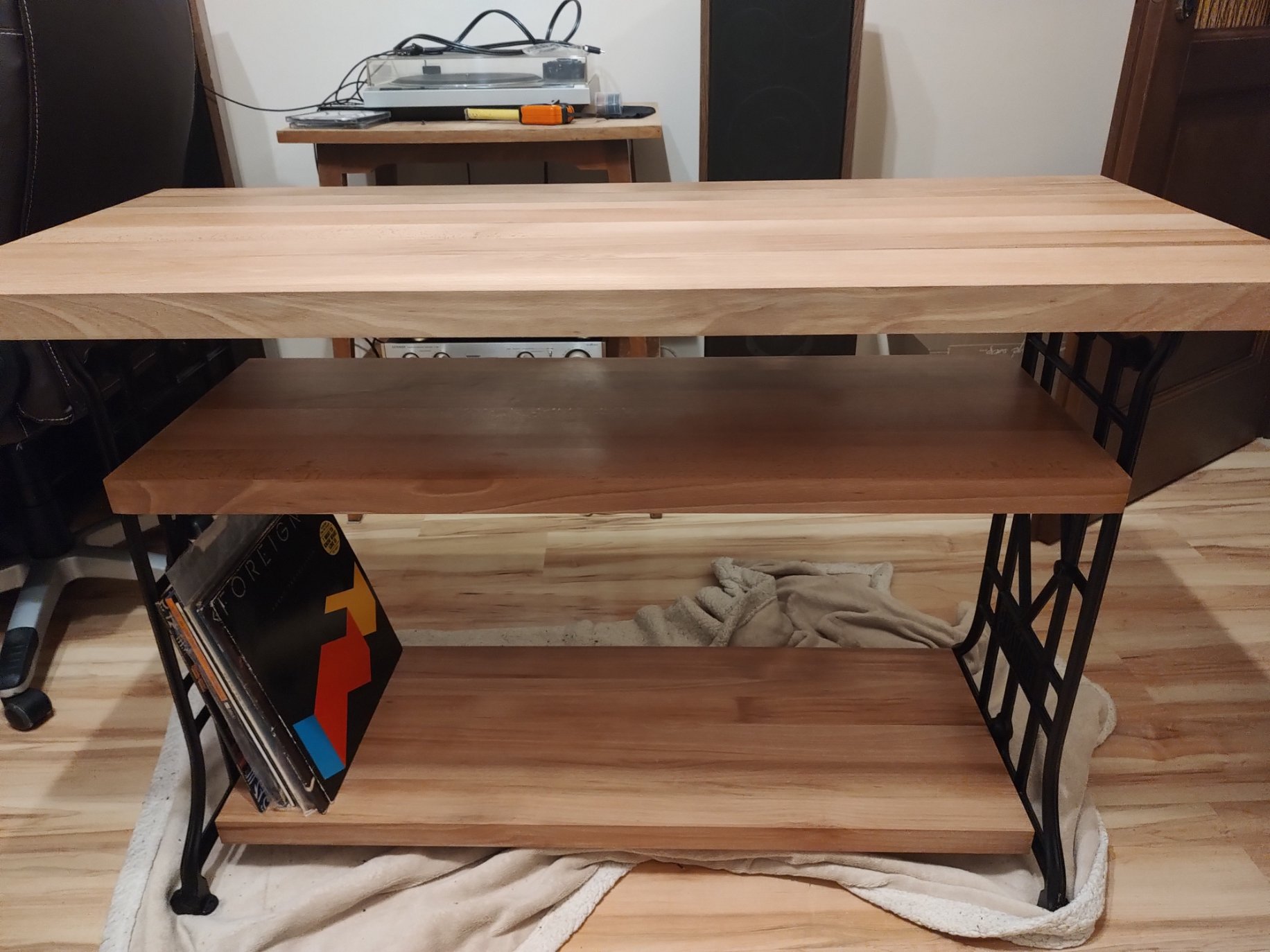 No i jest! Własnoręcznie skręcony i zaolejowany, z inspiracji kolegi Marcina Macphisto, stolik audio z elementów starej maszyny do szycia i bukowych blatów