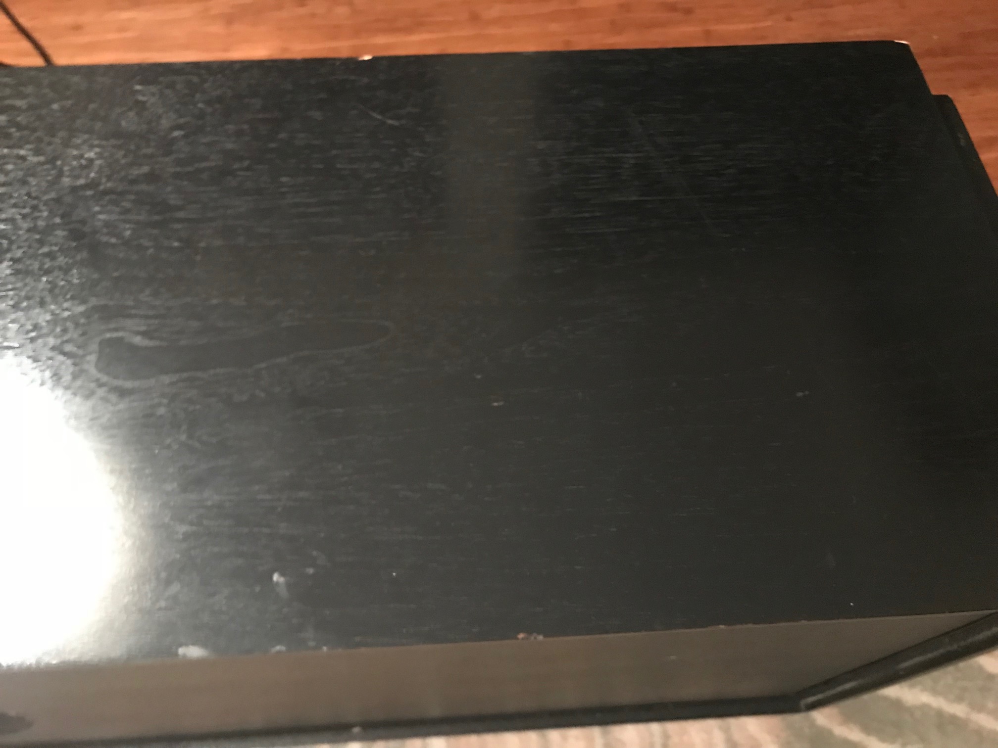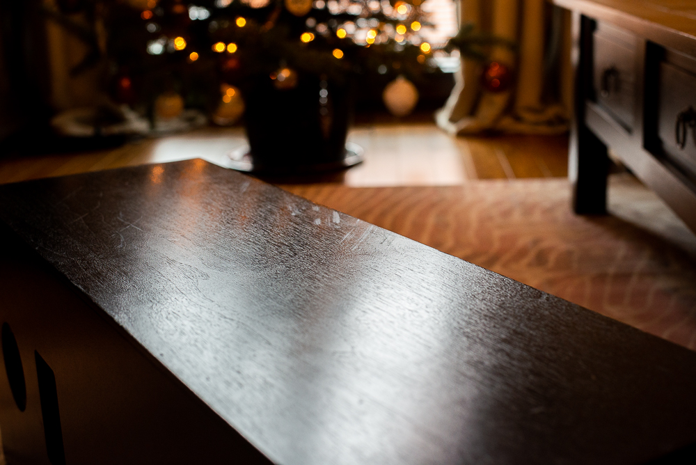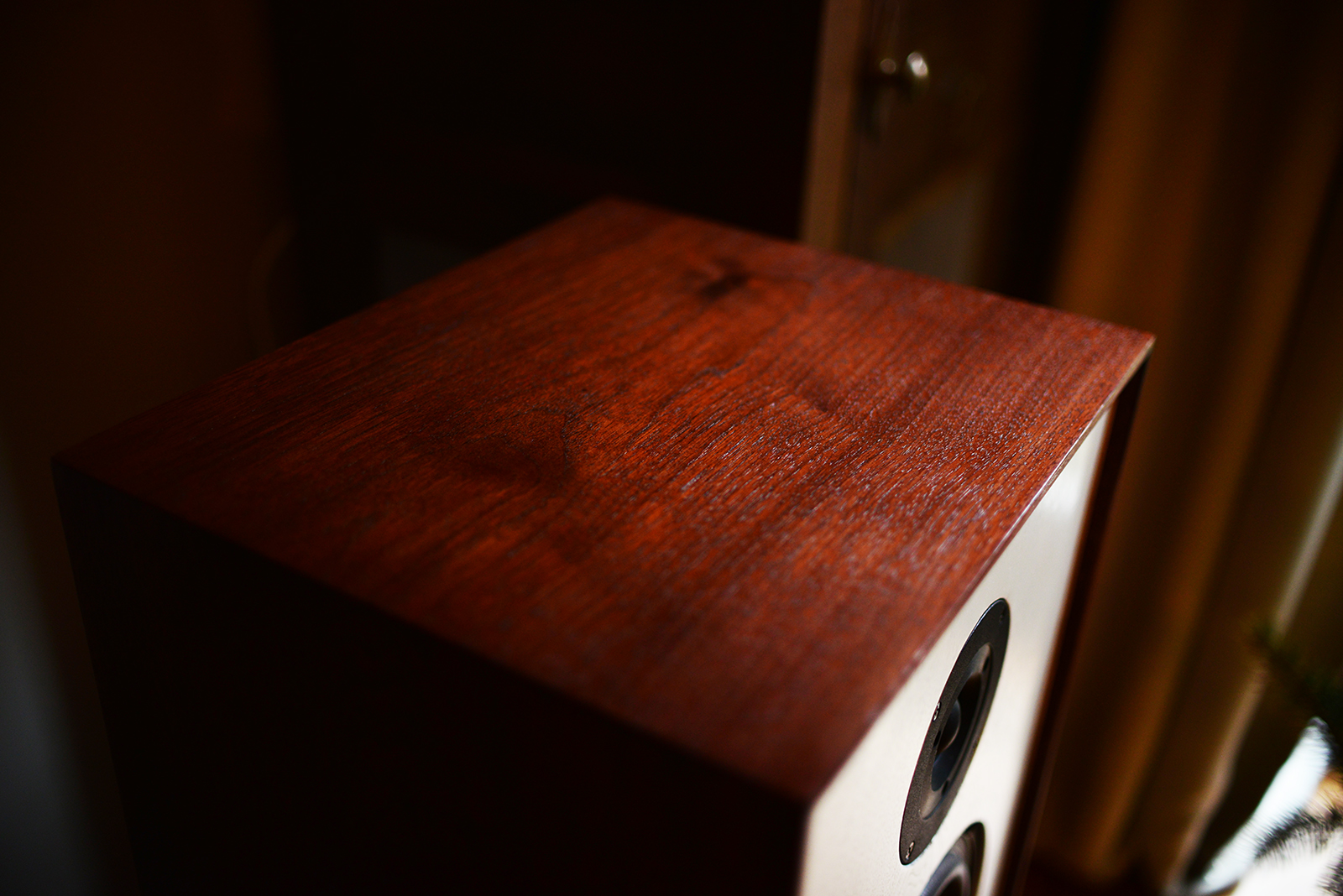 Bardzo cenię sobie naturalne drewno, stąd wybór padł na bardzo ładnie usłojony orzech amerykański, stolarz dobrał bejcę, która prawie w 100% trafił w to co sobie z kobitką wymyśliliśmy, front został również pokryty fornirem i pomalowany na kolor ecru. Smukłości bryle dodaje oryginalna ramka