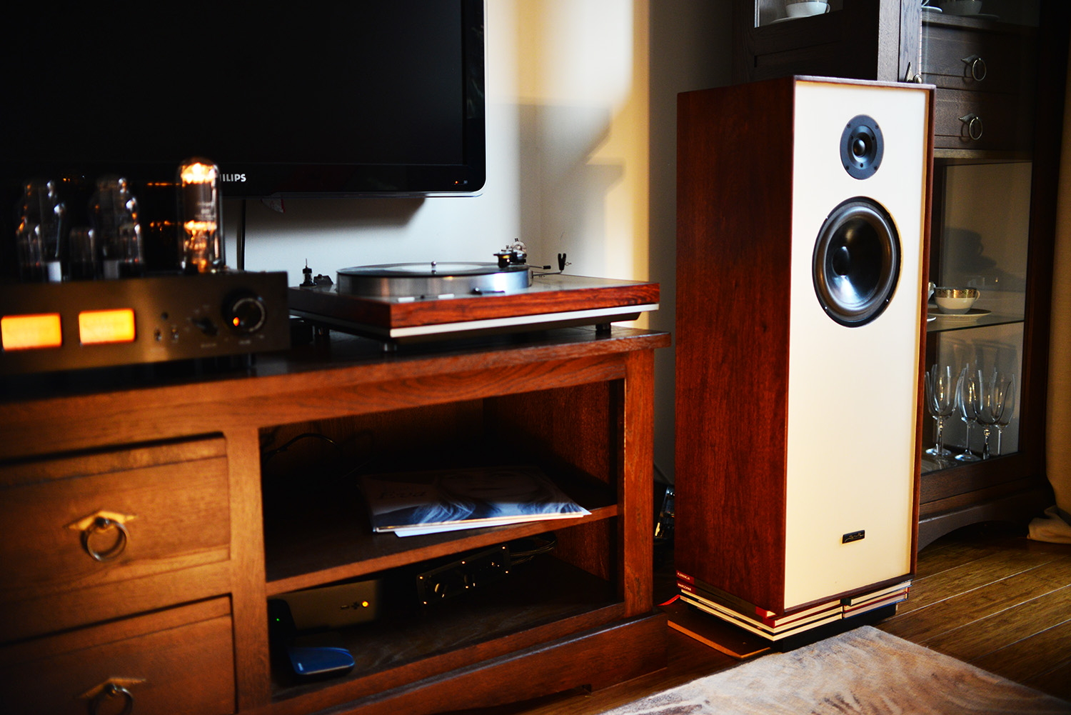 Idea była taka, aby front był jasny i rozjaśnił nasz dość ciemny salon, ale żeby też wpasowywał się w klimat drewnianych mebli, drewniane boczki luxmanów, także wszelkiego rodzaju lakiery high gloss odpadały.
