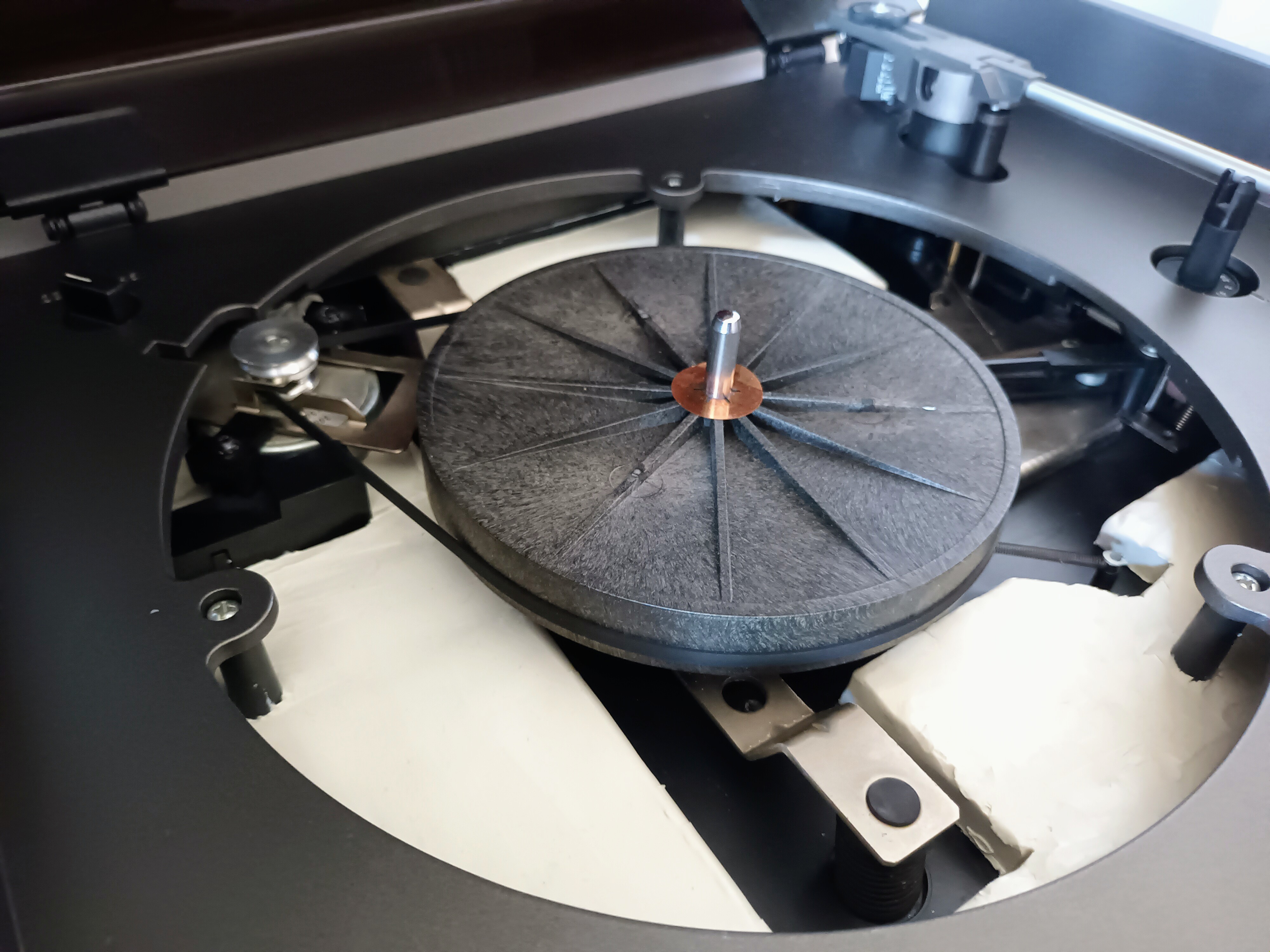 Gramofon oprócz tego że wyglądał jakby nie był używany to jeszcze Pan zwiększył jego ciężar wewnątrz plastelina, przerobił wyjście din na chinch i wymienił "zawieszenie", olej w amortyzatorze i pasek.