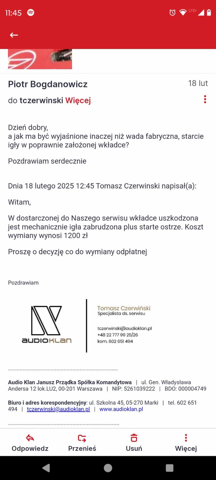 W ramach ciekawostki taka dygresja ,wrzucam screenshoty Poszli w to że igła to element eksploatacyjny. Ja że nawet jeśli to 2 miesiące to nie jest czas życia igły, i że nie ma zwyczaju zrzucać swoich błędów na innych, uzasadniałem że po 10 latach umiem skalibrować wkładkę zwłaszcza, że to bardzo podobny model do tych jakie używałem wcześniej. Samą wkładką też nie "jebłem" bo w sumie mam gramofon pełen automat i te rzeczy się nie dzieją. Ci nie uznali, że to podchodzi pod gwarancję. Ja poszedłem do rzecznika praw konsumenta, to samo wyjaśnienie, że igła to element eksploatacyjny rzecznikowi wystarczył. Jako że to trwało kilka miesięcy, to czas na decyzje co mają zrobić z elementem minął i już tak się sprawa zakończyła. A cenę wymiany igły postawili jak pamiętam większą niż jak mieli nową wkładkę w swoim sklepie.wojtek Ta historia z realizacją gwarancji na AT-VM540ML brzmi jak jakiś horror.